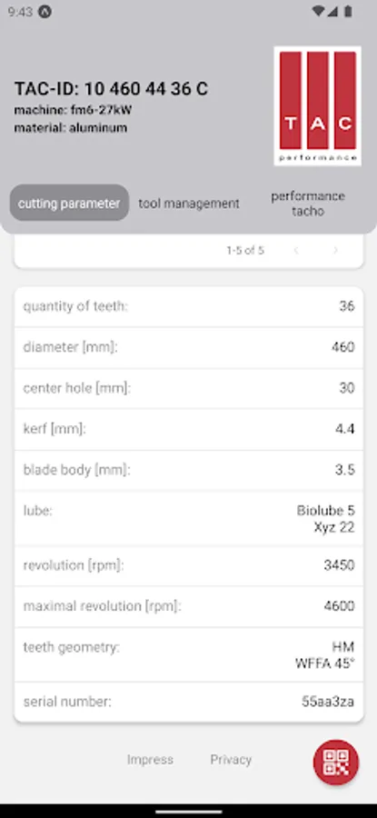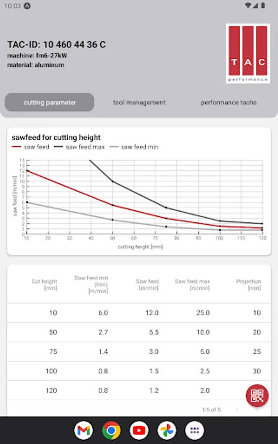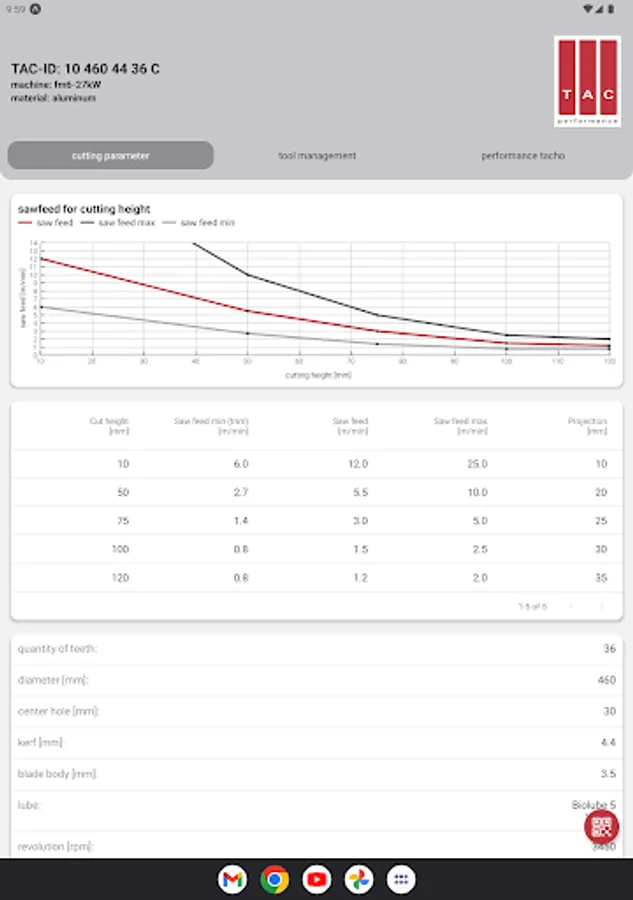 This App provides cutting parameters for TAC saw blades.