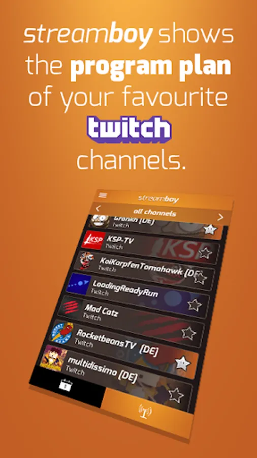 streamboy is for Twitch, what TV guides are for television. The app shows you upcoming streams on twitch neatly arranged. Whether at home on the sofa or on the go – by using streamboy, you can start your desired Twich channel with just one click.