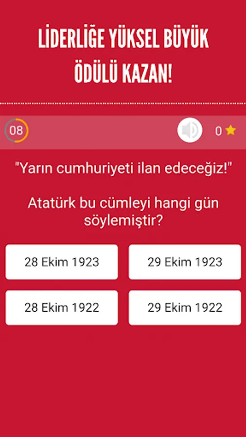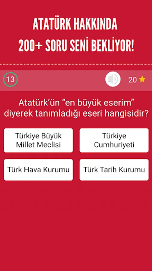 Mustafa Kemal Atatürk, the founder of the Turkish Republic, is one of the most important leaders in Turkish history. His vision and leadership played a major role in the formation of modern Turkey. Therefore, it should be the duty of every Turkish citizen to learn about Atatürk's life and ideas. "Atatürk Quiz" application is one of the most entertaining ways to learn about the leader of Turkey.