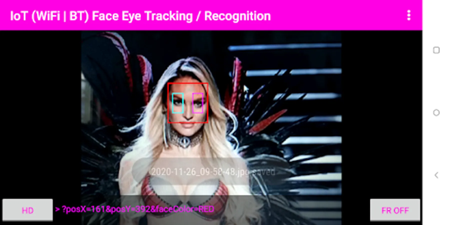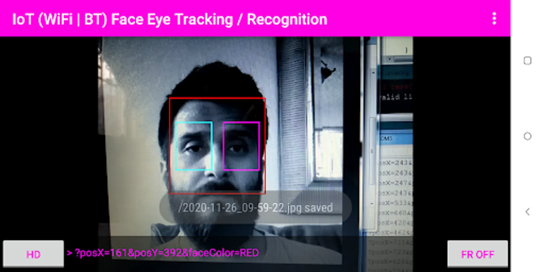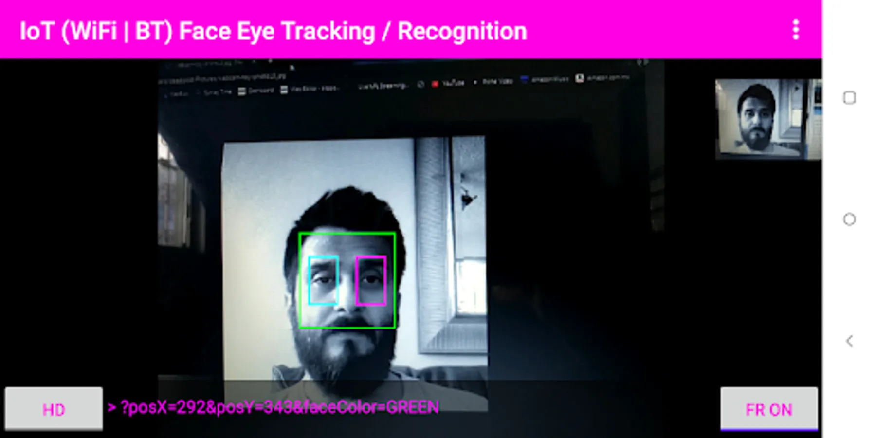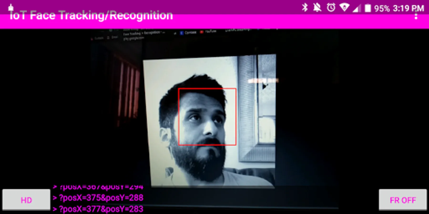 WiFi module receives information about the object through a WiFi module, in this case the ESP32 , ESP8266 and Breakout Board CC3000 from TI. The communication is done through UDP or TCP sockets client server "NOW COMMUNICATION CAN BE ACHIEVED THROUGH BLUETOOTH" the application in the mobile sends the necessary data (frame size, position and "face color" for horizontal and vertical servo) to the microcontroller so that this can perform the calculations with the information sent and perform the updates in the servos, in this case only the horizontal.