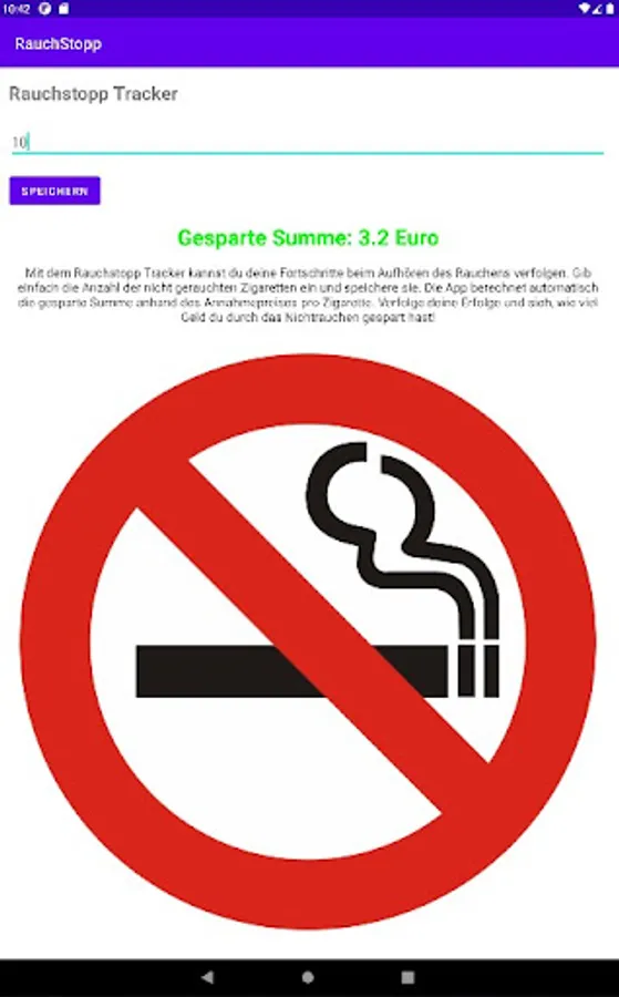 With Quit Smoking Tracker, you can track your progress in quitting smoking. Just enter and save the number of cigarettes you haven't smoked. The app automatically calculates the amount saved based on the acceptance price per cigarette. Track your achievements and see how much money you've saved by quitting smoking!