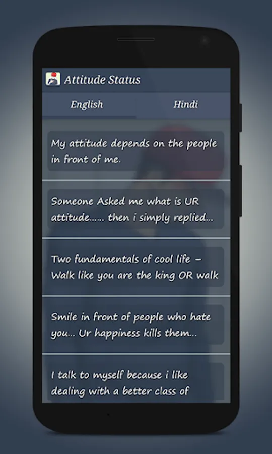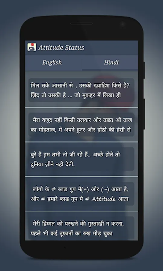 Attitude status includes the life status, rocking, me status, I love me and many more. It has the English and Hindi status.