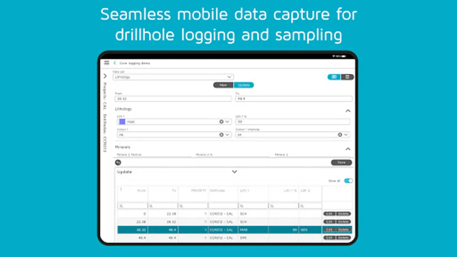 Rapidly capture samples and geological observations using a purpose-built interface for a range of drilling methods including RC, RAB, air core, blasthole and diamond drilling. Data capture forms are tailored to suit your drilling method, allowing you to instantly validate your data at the point of capture.