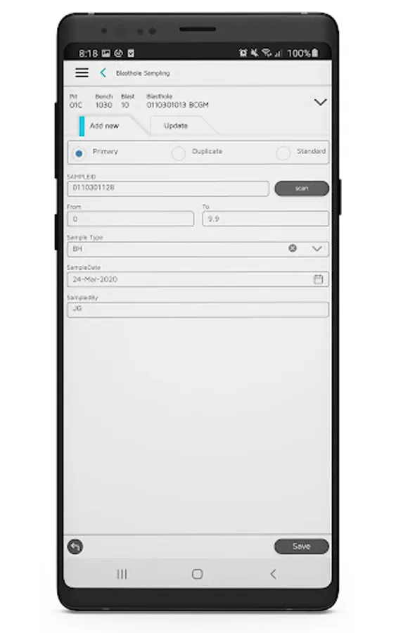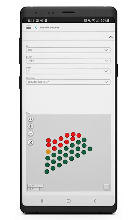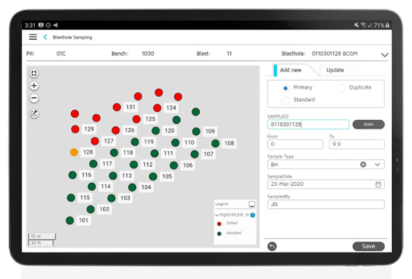 Visualise blastholes through an interactive map and capture samples from your mobile device. The app is spatially enabled, allowing pit technicians or samplers to position themselves on a map in relation to blastholes while working offline.