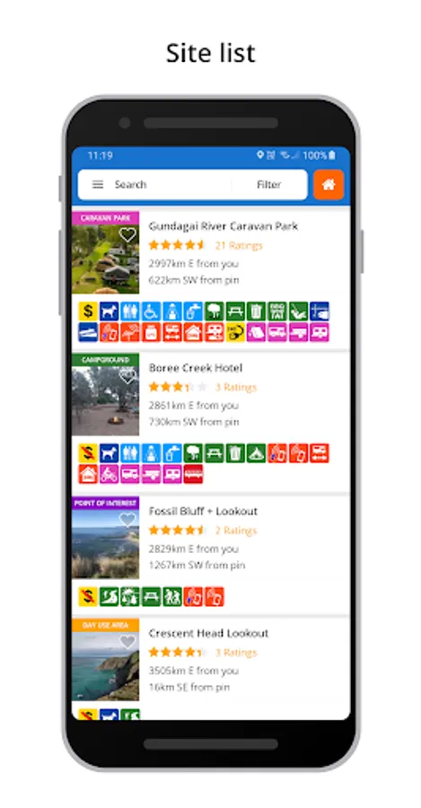 WikiCamps makes it incredibly easy to find sites. Simply bring up the site list to see sites nearest to your current location, or use the map screen to see exactly where they are on a street or satellite map.