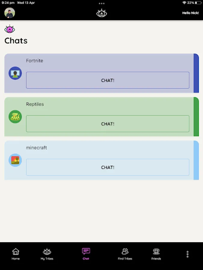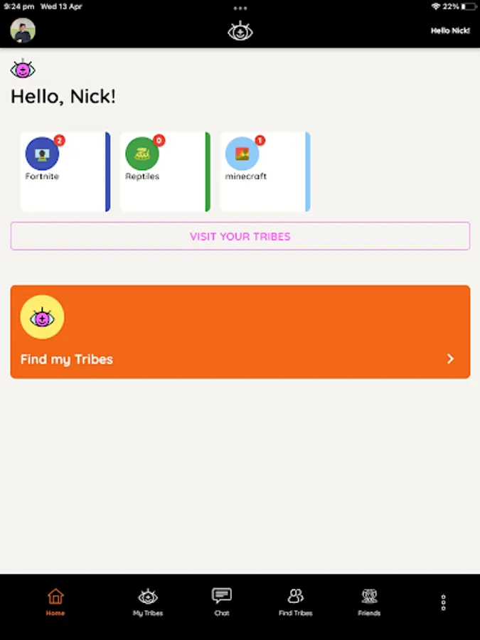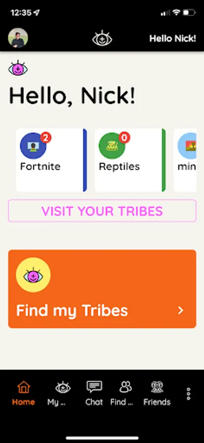 Kaboose opens to the home screen, where you can navigate to ‘find your tribe’.