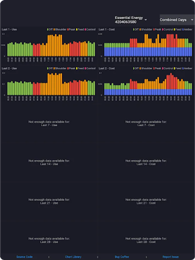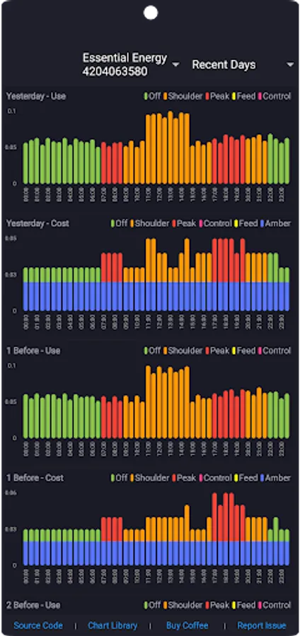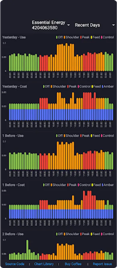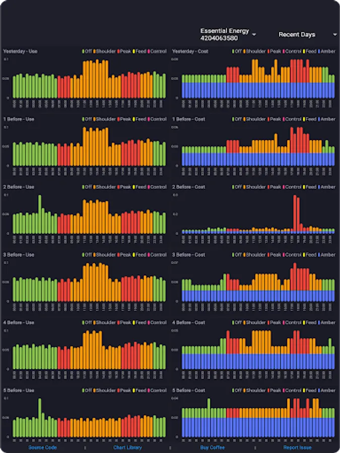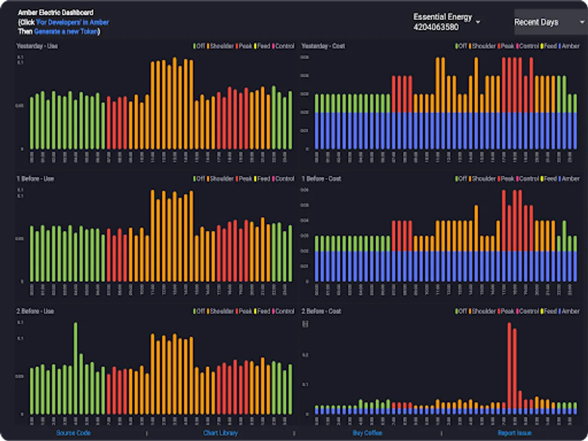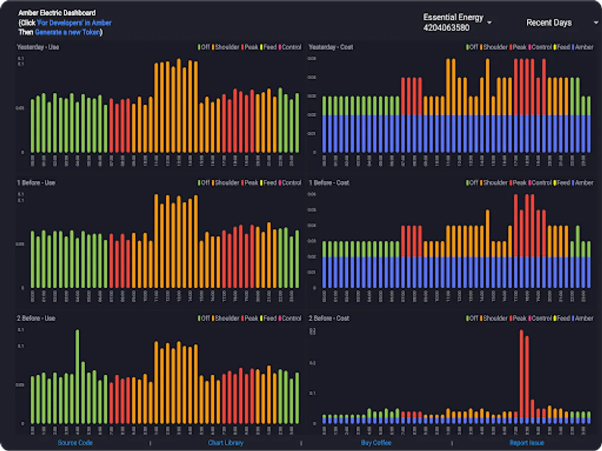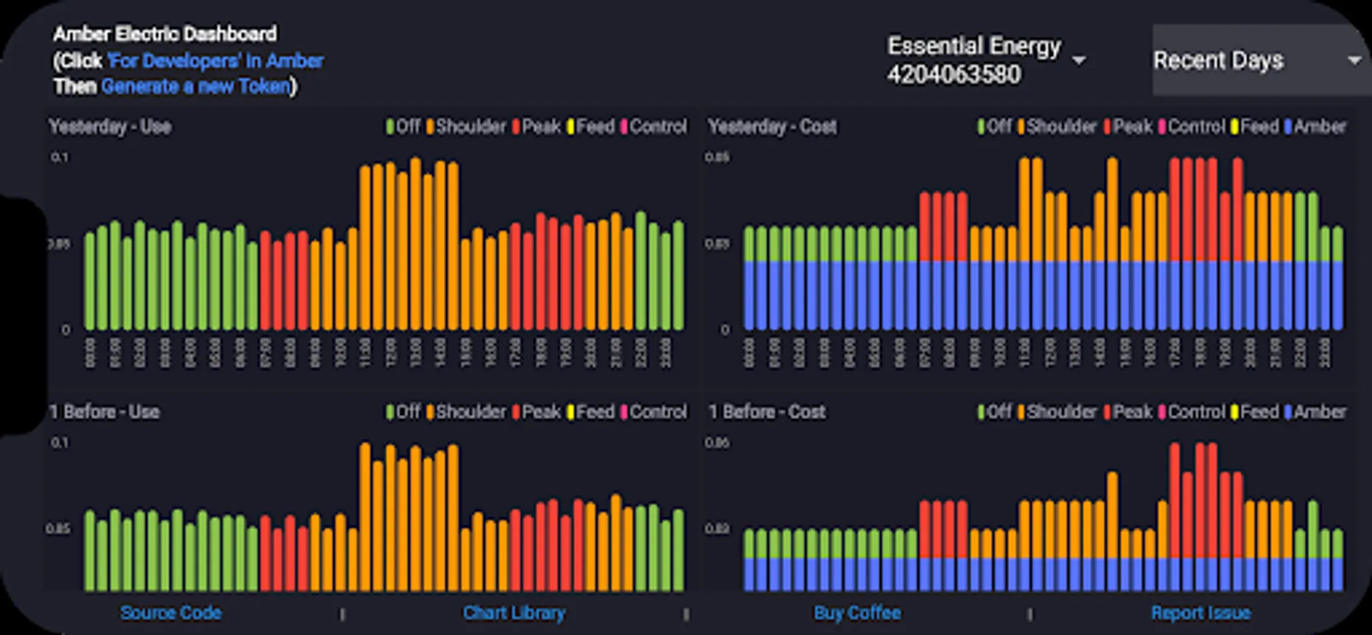 Visualise your Amber Electric electricity consumption using this dashboard. You will need to log into your Amber account, enable "For Developers" and generate a "API Token" for your account. The token stays locally on your phone and is not sent to us. You only have to do this once.