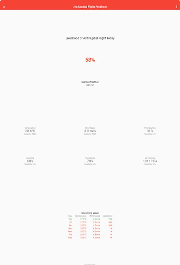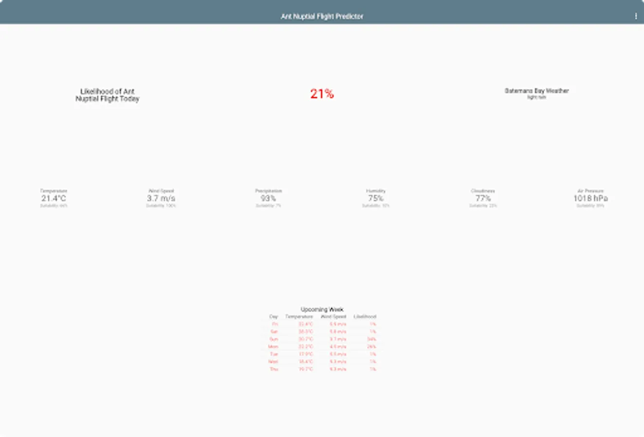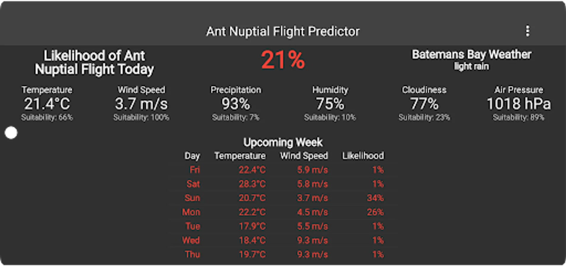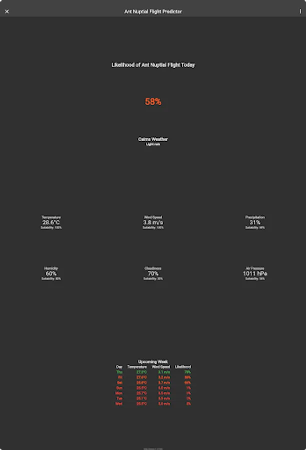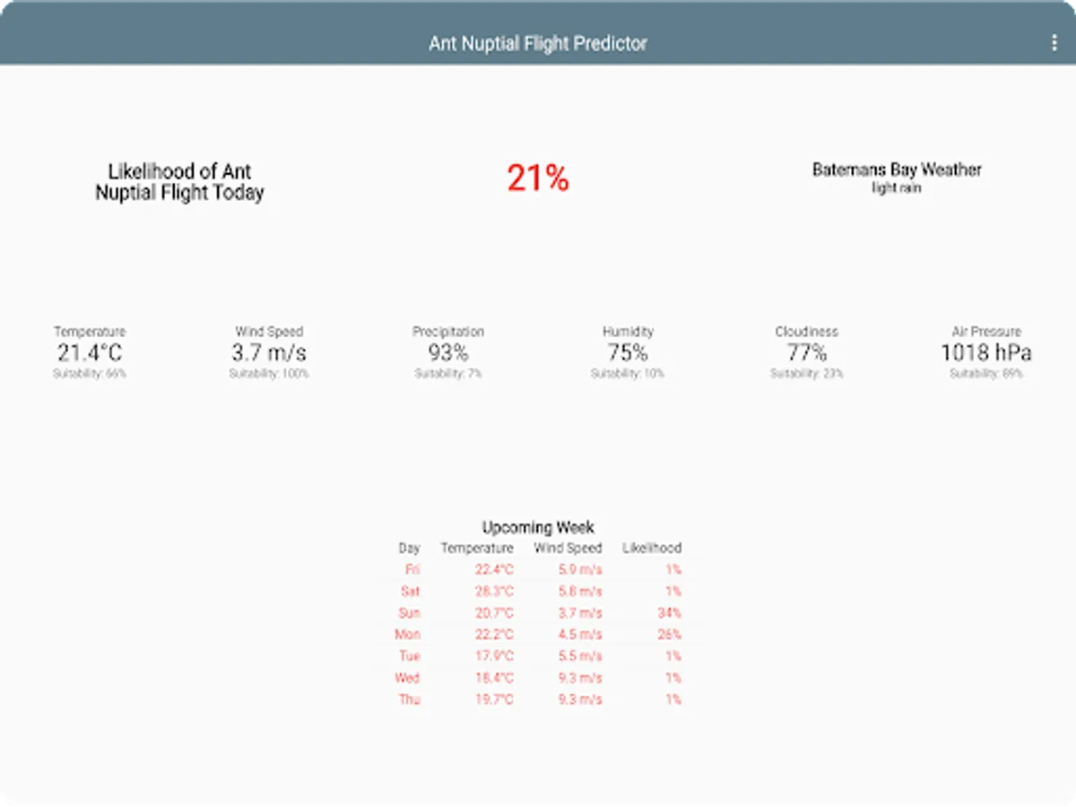 Ant Nuptial Flight Predictor downloads the weather in your current location and gives you the rough likelihood that queen ants are flying near you today and for the next week. When the percentage is high, time to get outside and looking for ants in your local area!