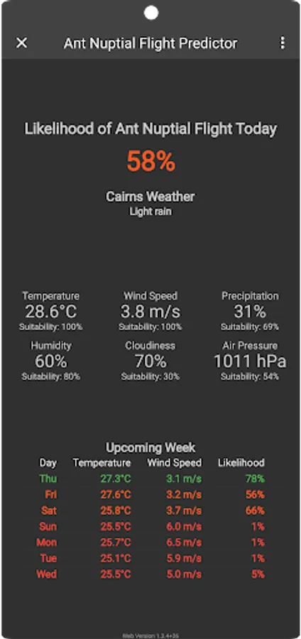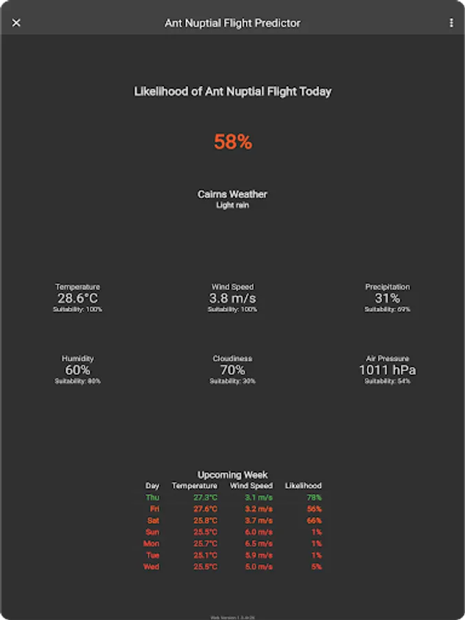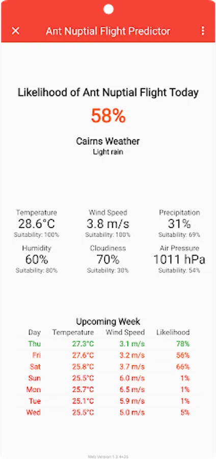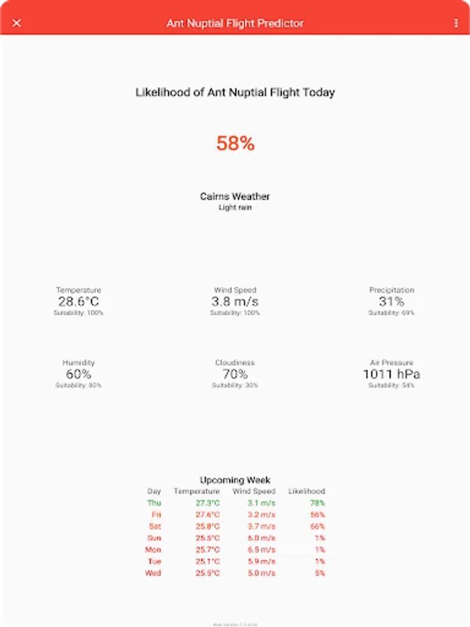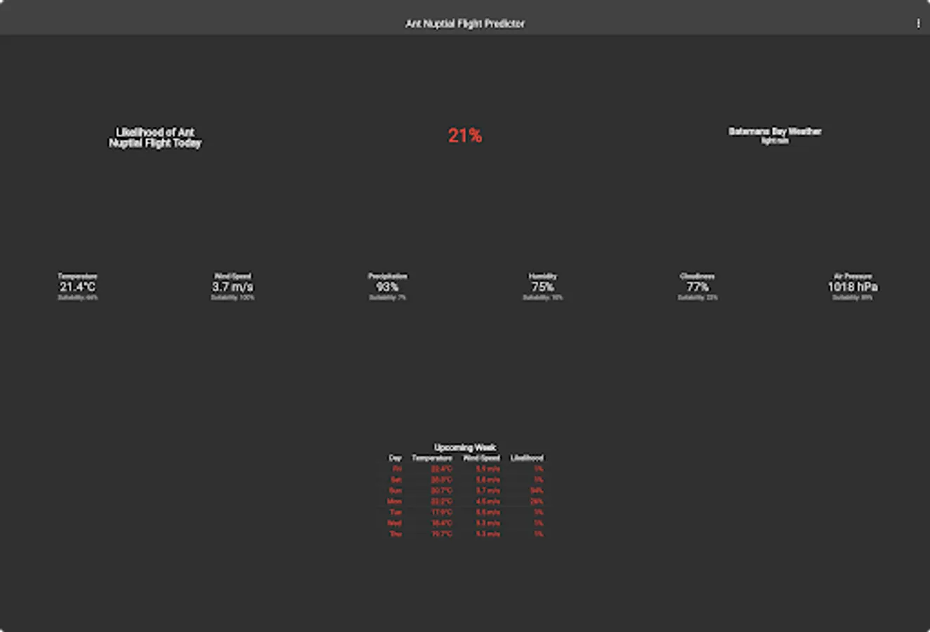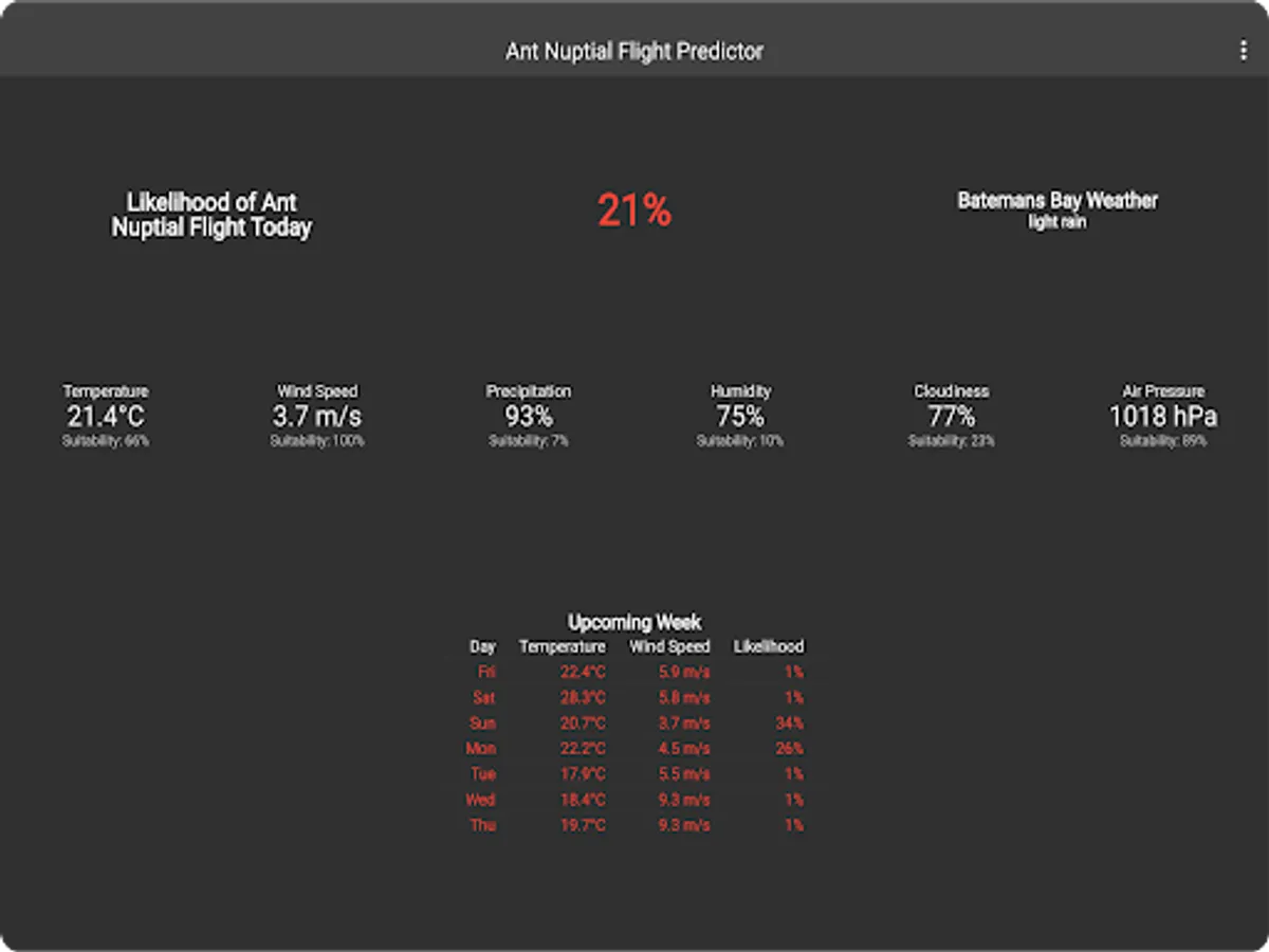 Ant Nuptial Flight Predictor downloads the weather in your current location and gives you the rough likelihood that queen ants are flying near you today and for the next week. When the percentage is high, time to get outside and looking for ants in your local area!