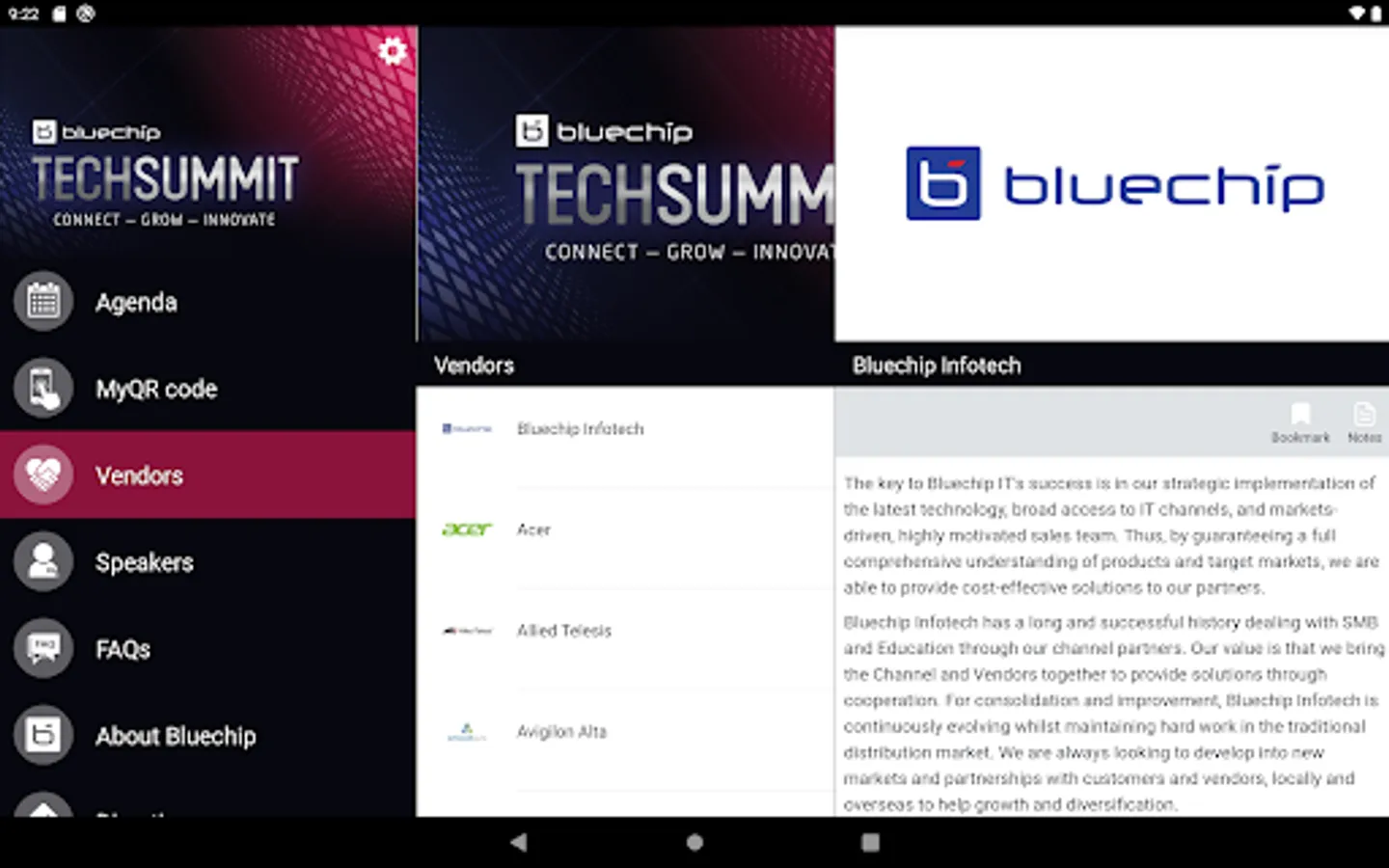 Discover all the essential details for the Bluechip TechSummit 2023 conference with our official app! Join us in Perth, Melbourne, Brisbane, and Sydney for an exciting event featuring renowned keynote speakers like Mark Iles and Ryan Spilane, along with an impressive panel of experts. With over 30 vendors and networking opportunities, this app is your gateway to unlocking the full potential of the conference. Stay ahead of the game with our comprehensive agenda, get to know the esteemed speakers through detailed bios and gain valuable insights from their expertise. Engage in real-time Q&A sessions, where you can ask burning questions and receive responses directly from the panellists. Finding your way to the conference has never been easier! The app provides convenient directions, parking and transport information, ensuring a seamless experience from start to finish. Connect with fellow attendees, vendors, and industry leaders through our networking features, fostering valuable connections and potential collaborations.