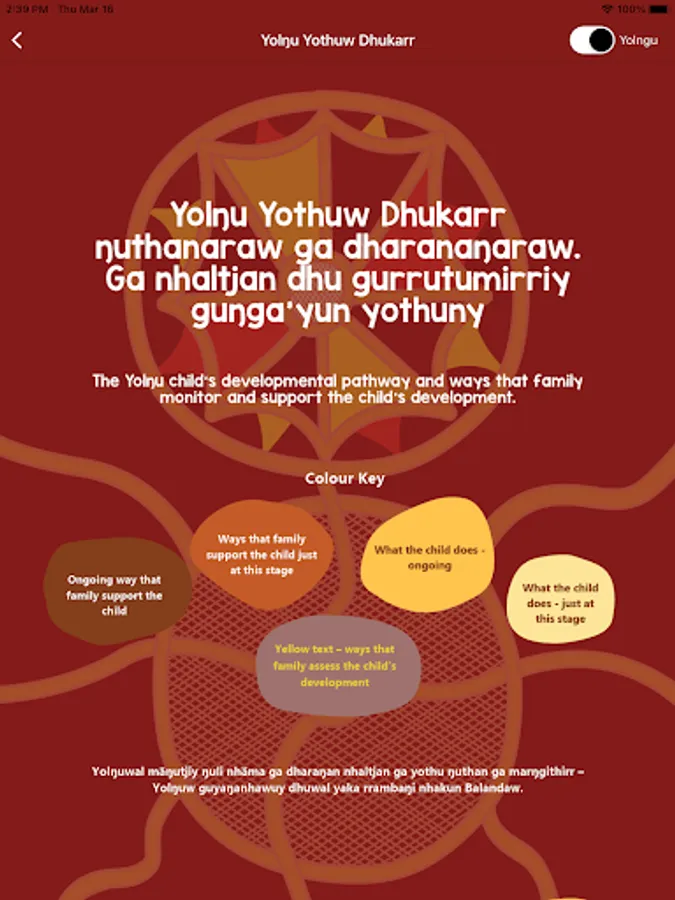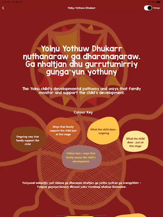 - a Yolŋu child’s developmental pathway including ways that family monitor and support children’s development;