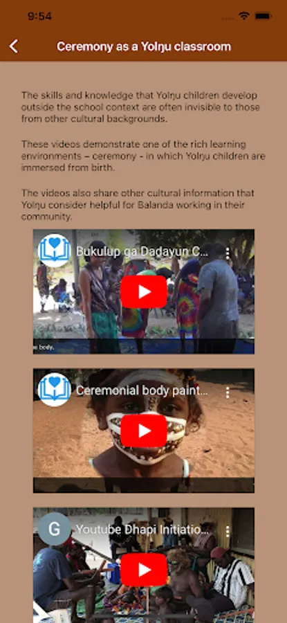 - videos to support Balanda to recognise Yolŋu education processes within ceremonial contexts.