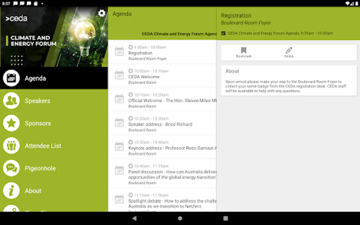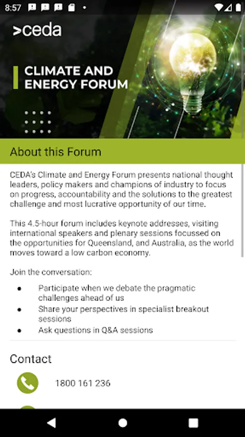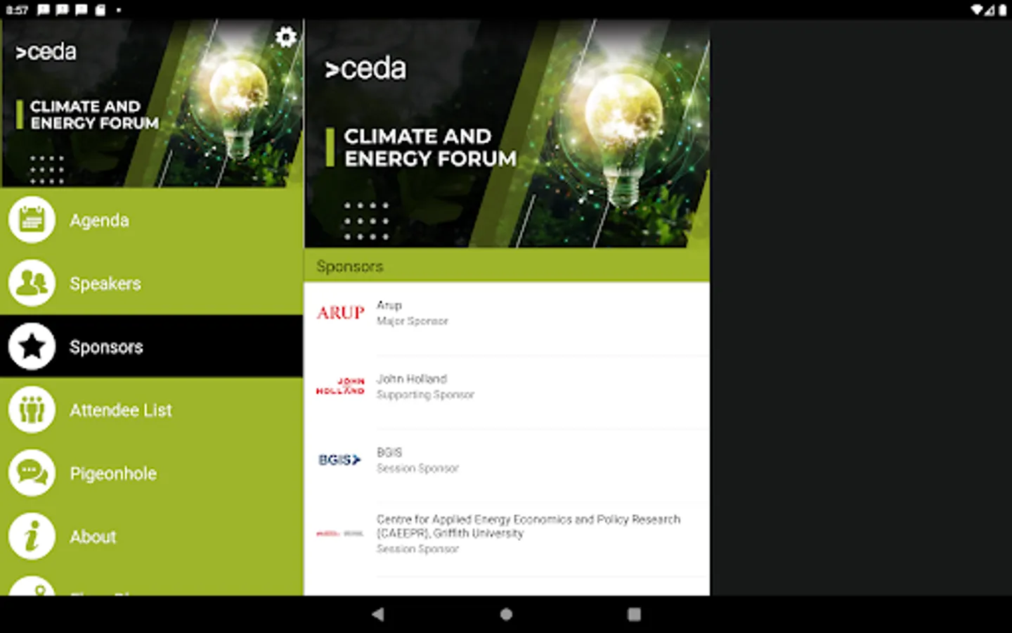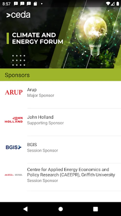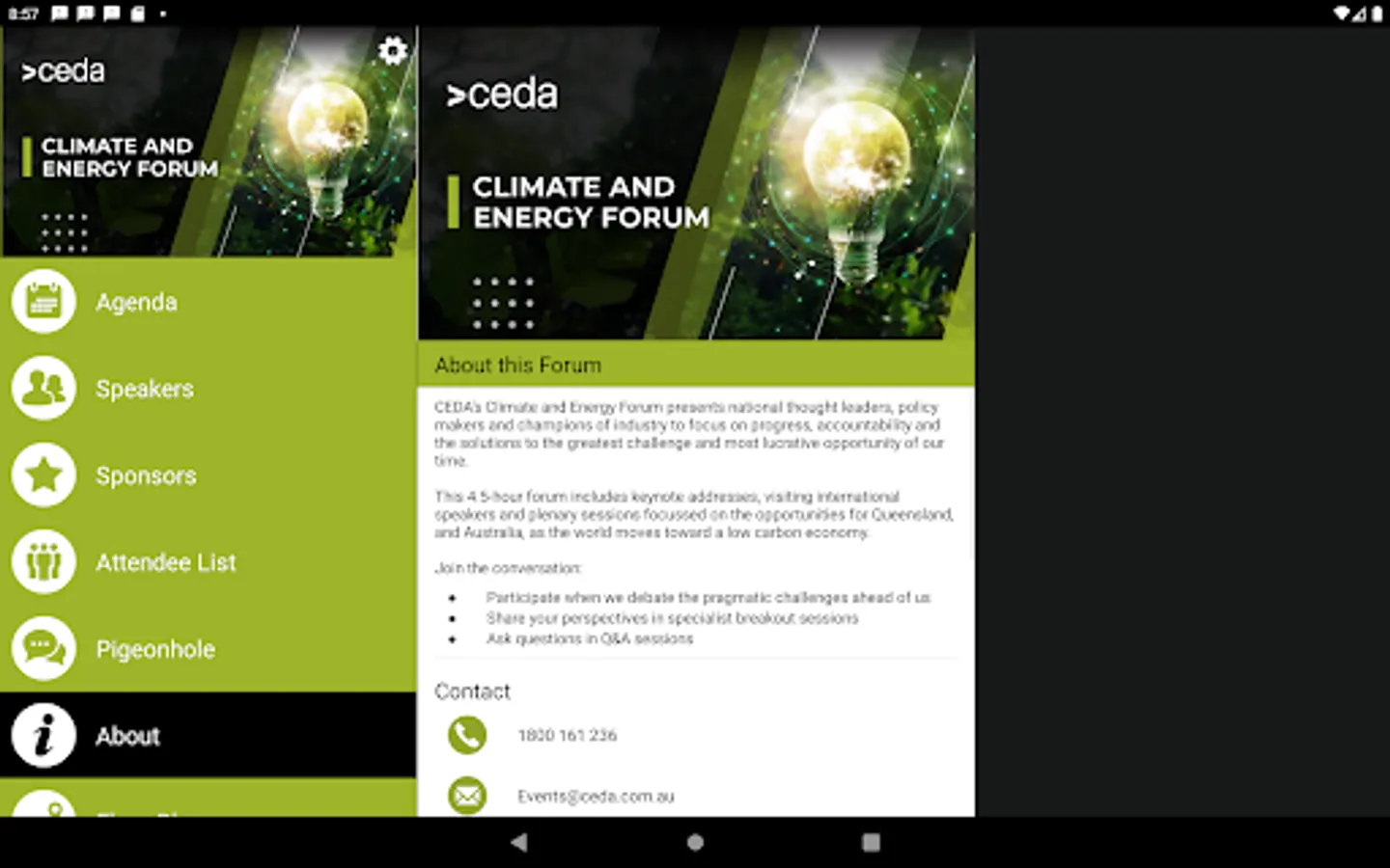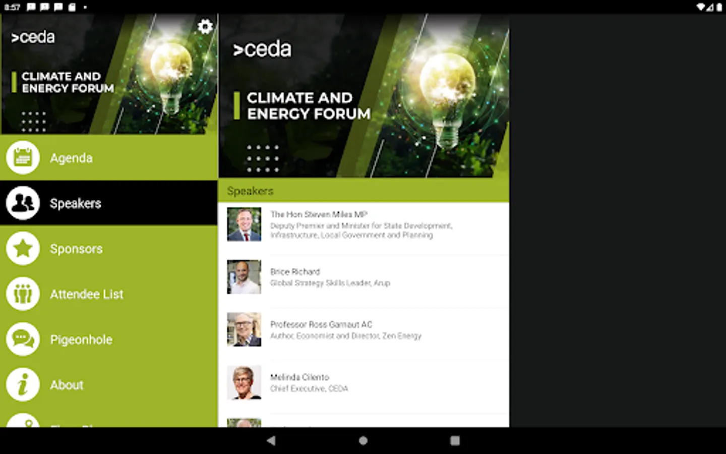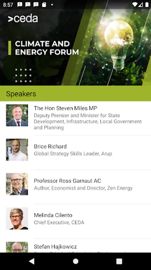 Join the conversation with CEDA at our Climate and Energy Forum. At this forum, we will hear from local and global leaders across policy and industry throughout a day of plenary and breakout sessions, focusing on progress, accountability and the solutions to the greatest challenge and most lucrative opportunity of our time. Connect and engage with attendees, ask questions, see the agenda, learn about speakers, share your thoughts on the activity board and more with CEDA’s Climate and Energy Forum app.