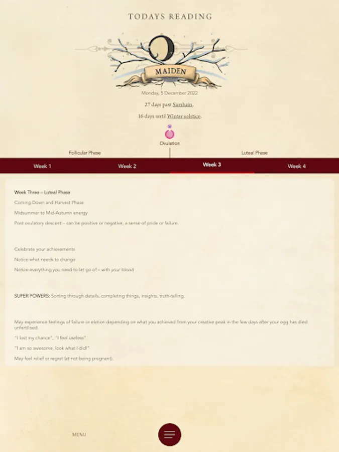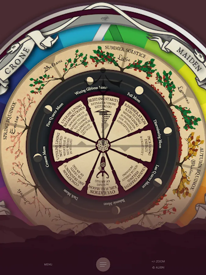 Connect with the wisdom of your menstrual, lunar, earth seasons, and life cycles. Locate any day on our app to see what's happening in the cycles, and gain cycle wisdom and awareness with information on sabbats, moon phases, fertility mapping, and natal lunar phase return mapping. Based on live NASA data, use Spinning Wheels to track and build self-awareness, connect with the cycles, and understand their impact.