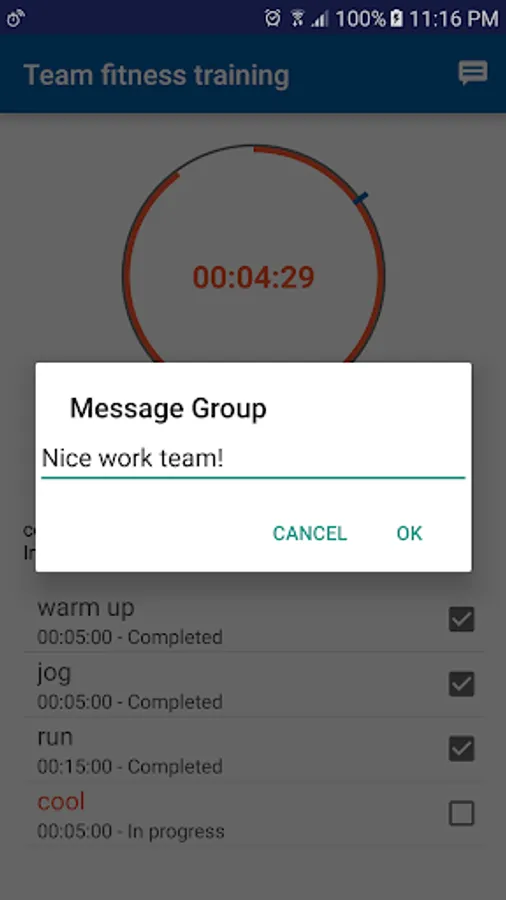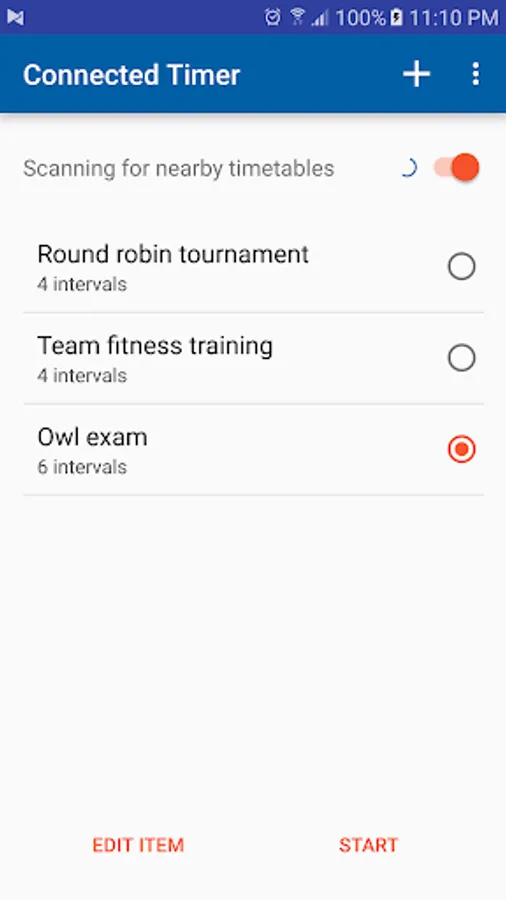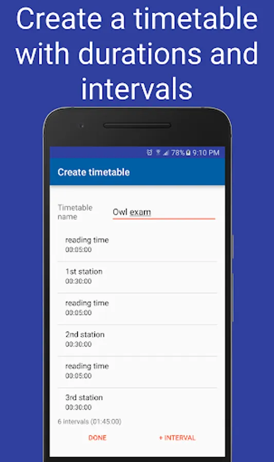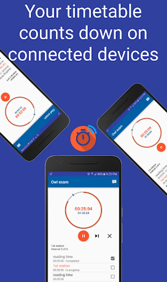 Create the timetable and enter each interval and duration. Then, join the timetable on other devices by running the app, and selecting the timetable when it appears. Start the timetable from any device, and they will all count down together.