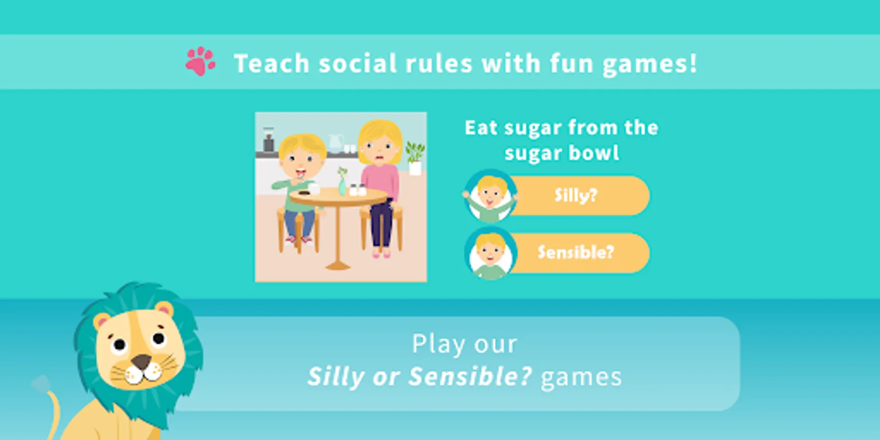 Social rules are often assumed, not explained. Instead of telling your child “the rules”, let them play our Silly or Sensible? game. Each game teaches social rules in different contexts. You can then have fun with your child discussing the reasons behind each, and praise them for correct answers. It’s a light-hearted way of explaining social rules in advance. Fun sounds and gorgeous illustrations really set the scene!