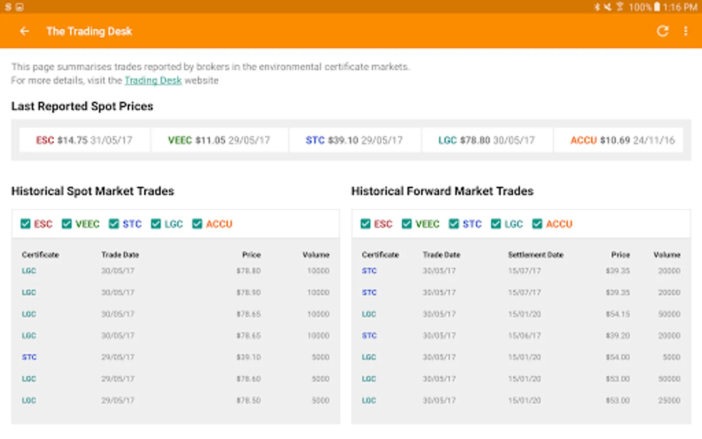 • Real-time wholesale certificate prices both spot and forward certificates;