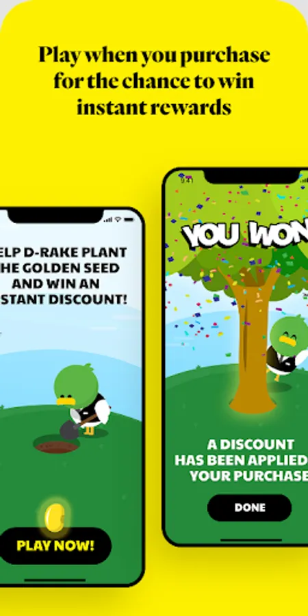 - Play to win instantly at the register! Forget collecting points - play a game with D-Rake the Duck for your chance to win money off your shop!