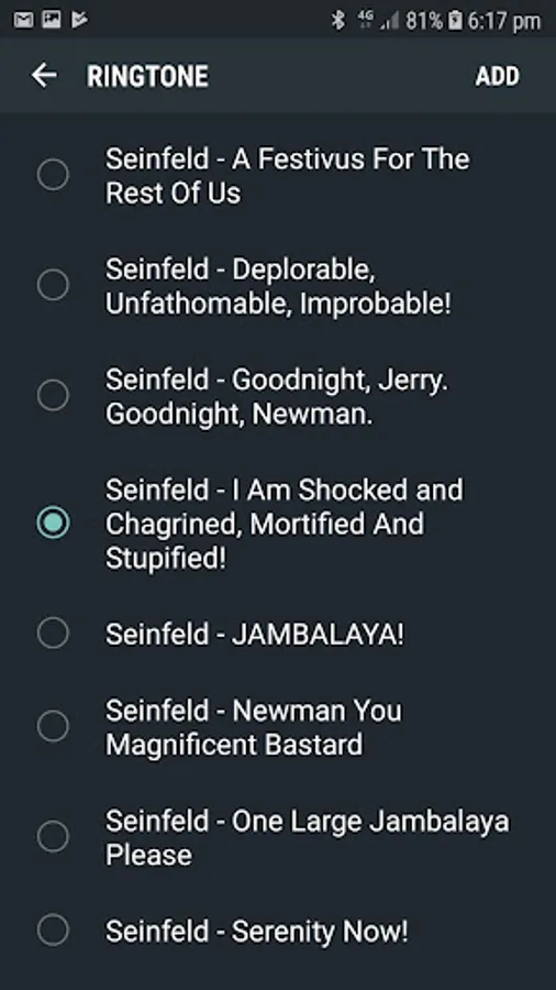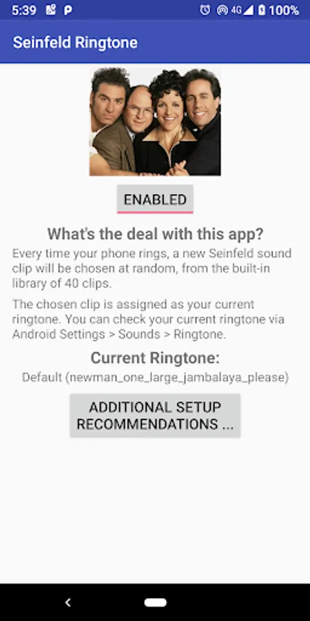 Bring some light hearted fun into your day! Every time your phone rings, a new Seinfeld sound clip will be chosen at random, from the built-in library of 50 clips.