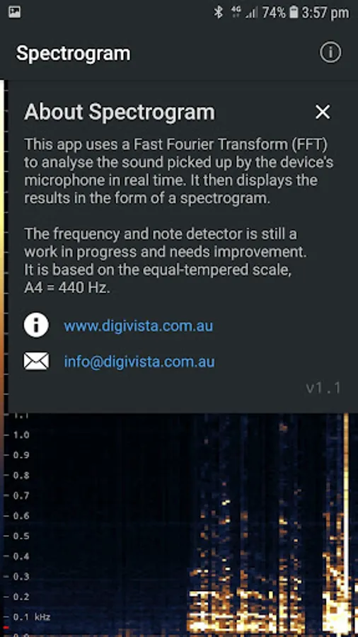 This app uses a Fast Fourier Transform (FFT) to analyse the sound picked up by the device's microphone in real time.