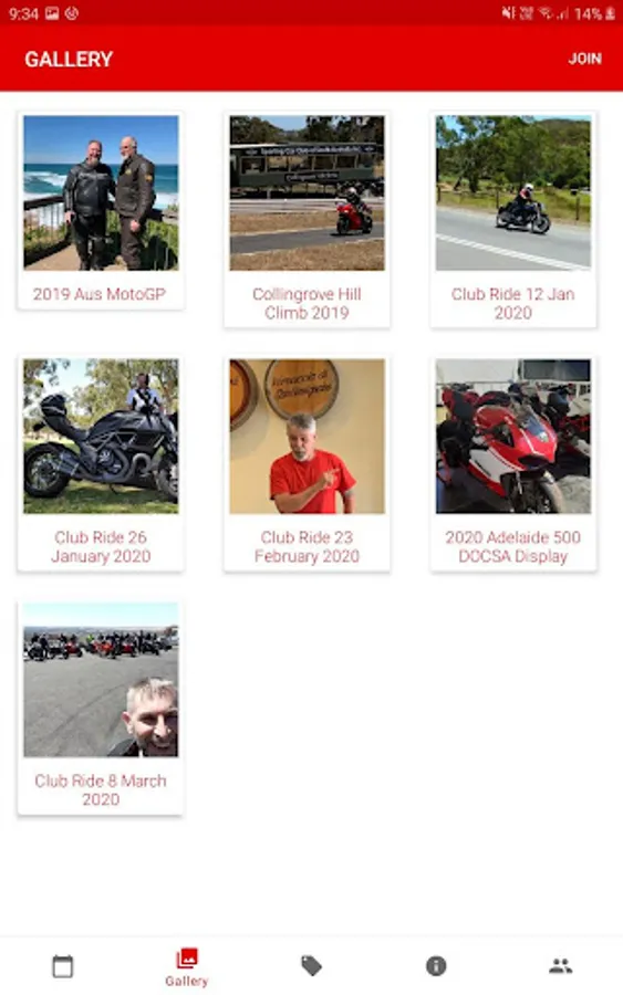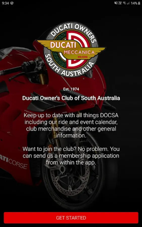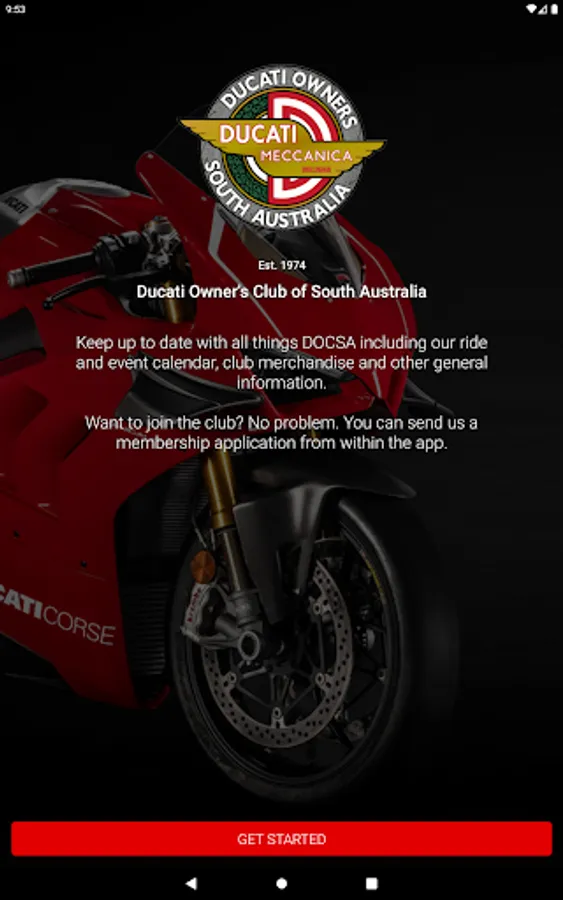 Welcome to the Ducati Owner's Club of South Australia mobile app. Club members and Ducati enthusiasts can use the app to keep up to date with the latest information from the club, including our ride and event calendar, photo galleries, club merchandise and other general information.
