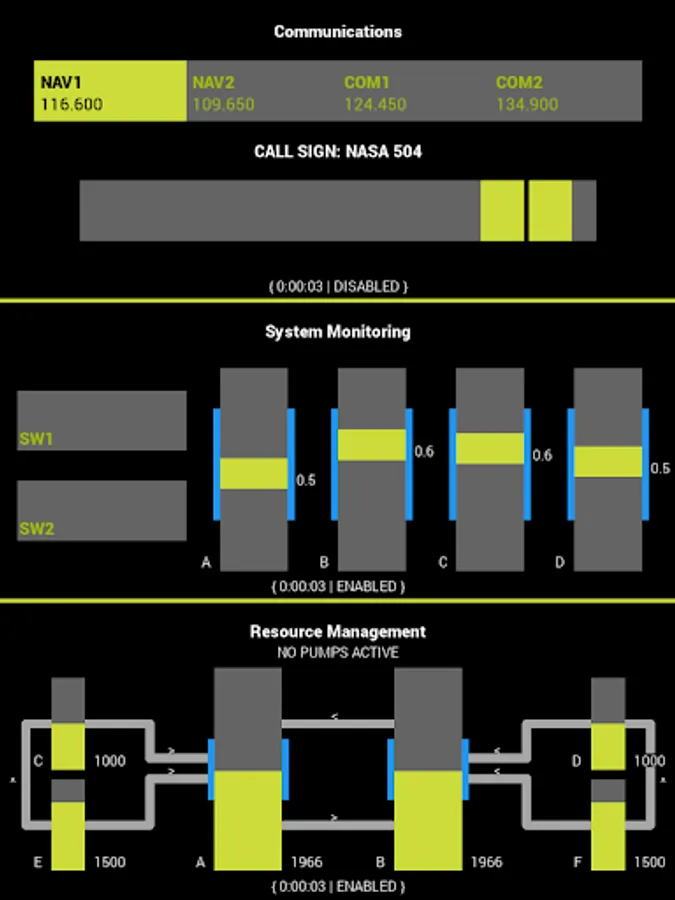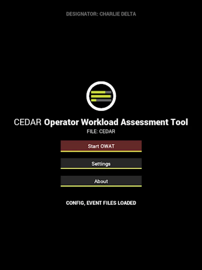 Cedar OWAT is based on NASA’s MATB-II desktop application. The principal design goal was to adapt MATB-II for the tablet platform, providing a solution that can be deployed to support human factors studies in non-office environments.