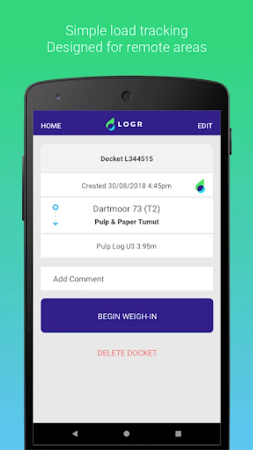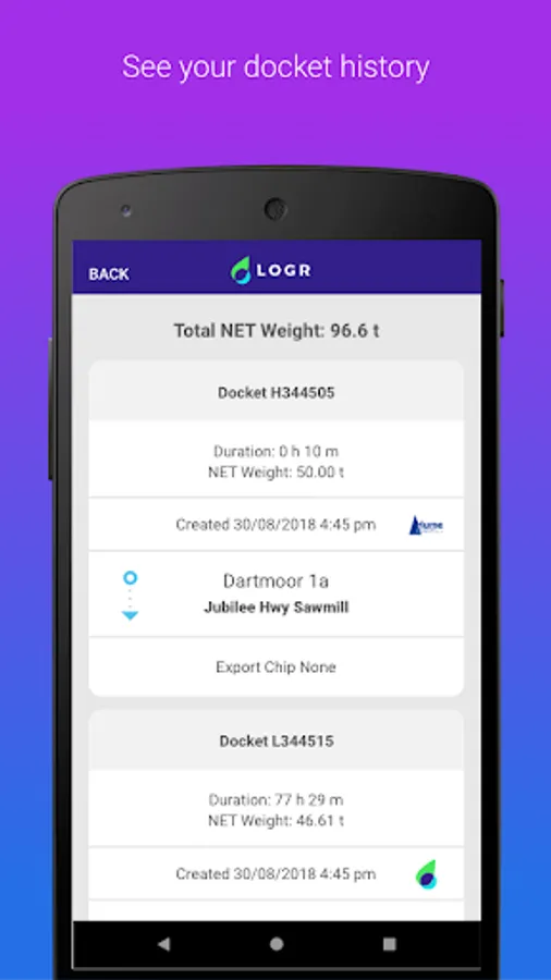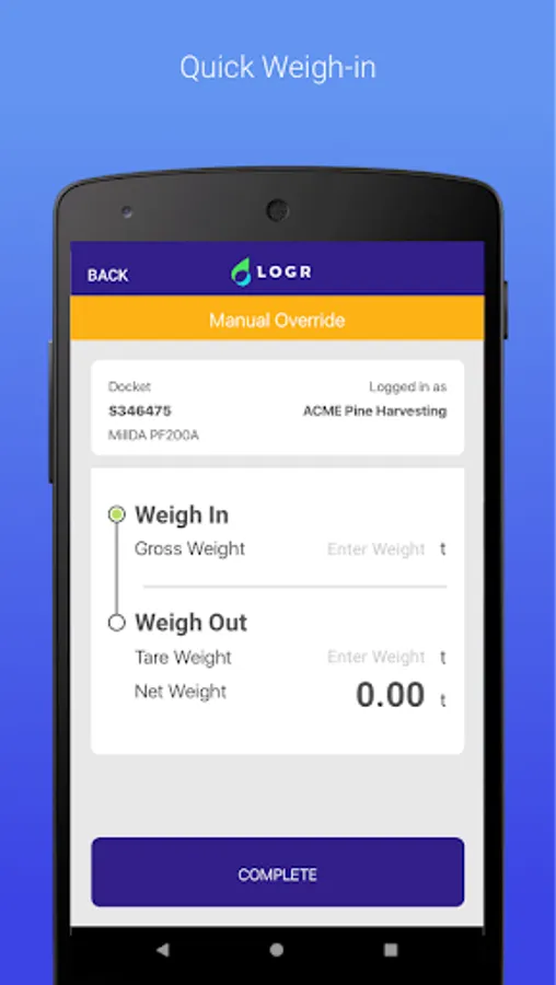 At the delivery location, drivers weigh their trucks and enter the gross weight into the app. After unloading their trucks, they then enter the TARE weight. The net weight of the wood is calculated automatically.