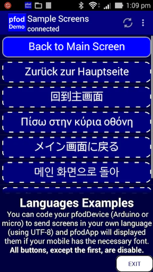Using the pfodApp on an Andriod mobile, your users can read text prompts, send navigation commands, traverse menu hierarchies, choose from single and multi-selection lists, input with sliders, and numbers and text and view data sent by your micro, in their own language. This version of pfodApp supports non-English menus and screen texts.