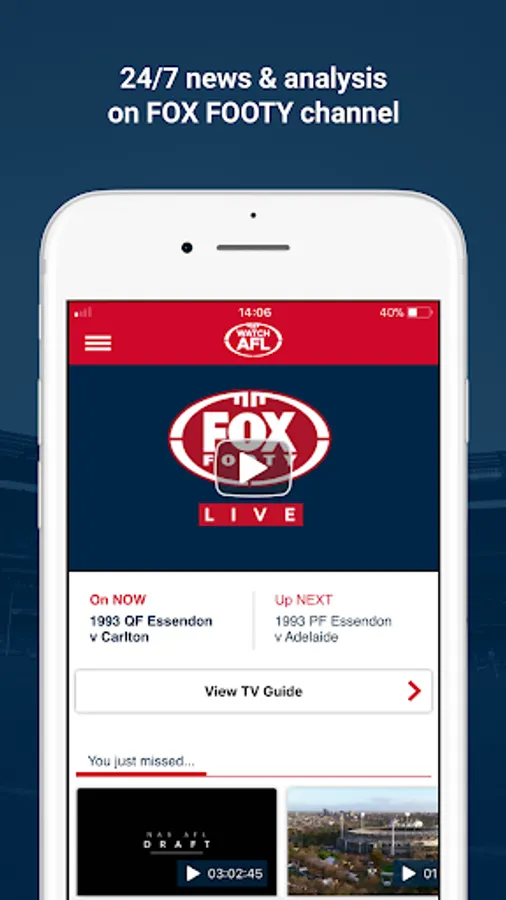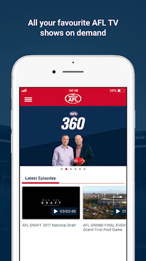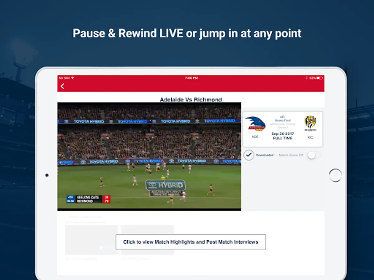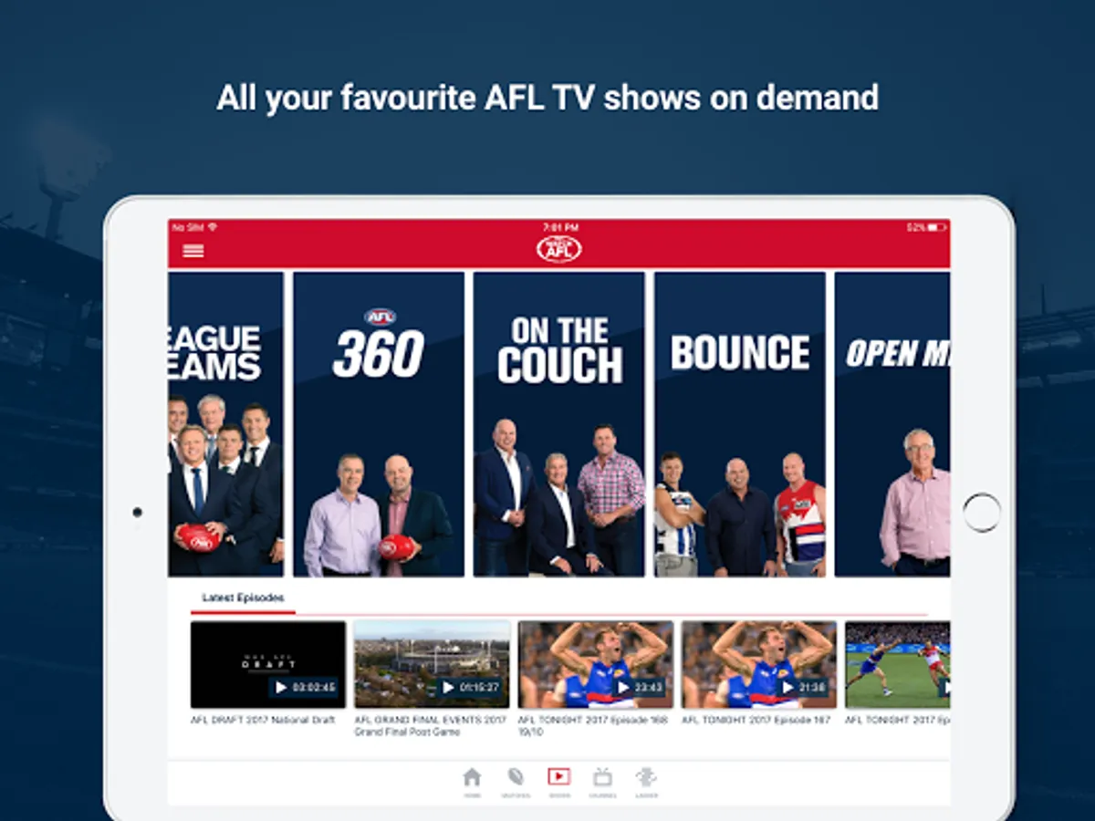 Grab a subscription and get all the AFL action you love including the 2018 Toyota AFL Premiership Season & Finals Series LIVE and on demand, with loads of new features that put you in control. Plus watch all the NAB 2018 Women's Competition and all the action in the JLT Pre Season competition.