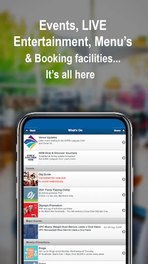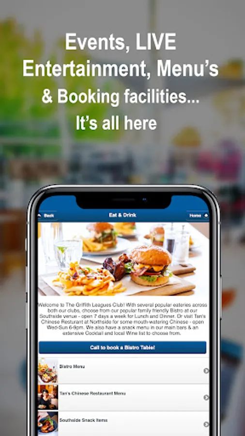 The Griffith Leagues Club App will provide its members and guests with day to day activities, entertainment, dining menu’s and special events: