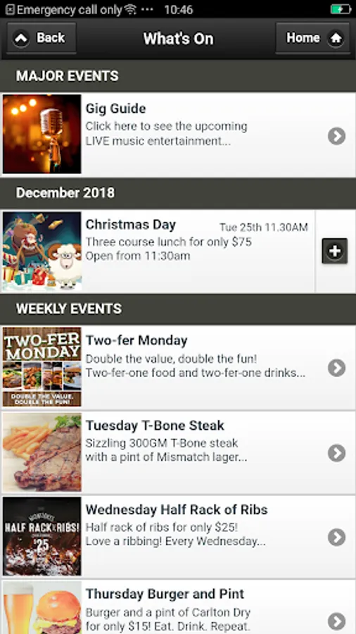 Day to day activities, Featured events, LIVE entertainment, Weekly performing artists, Dining menus, Daily specials and it notifies you on all special events. It provides you with all the venue’s information & news at your finger tips & more