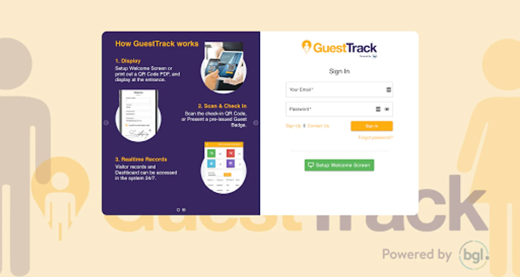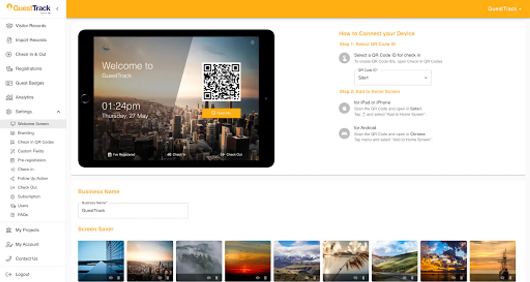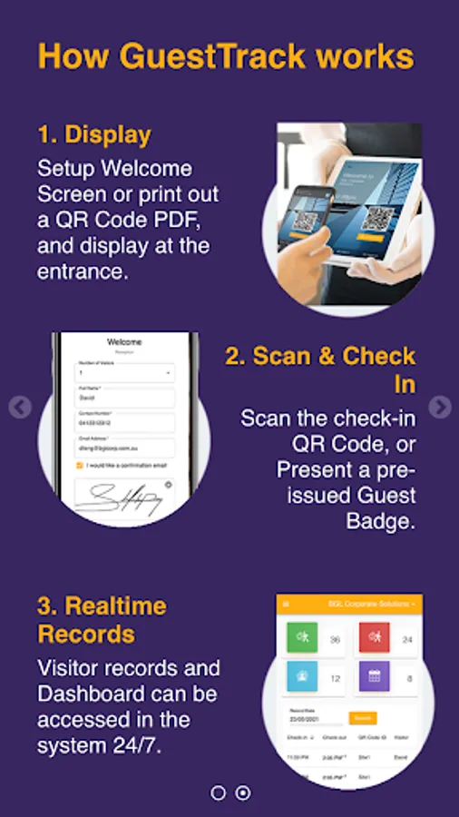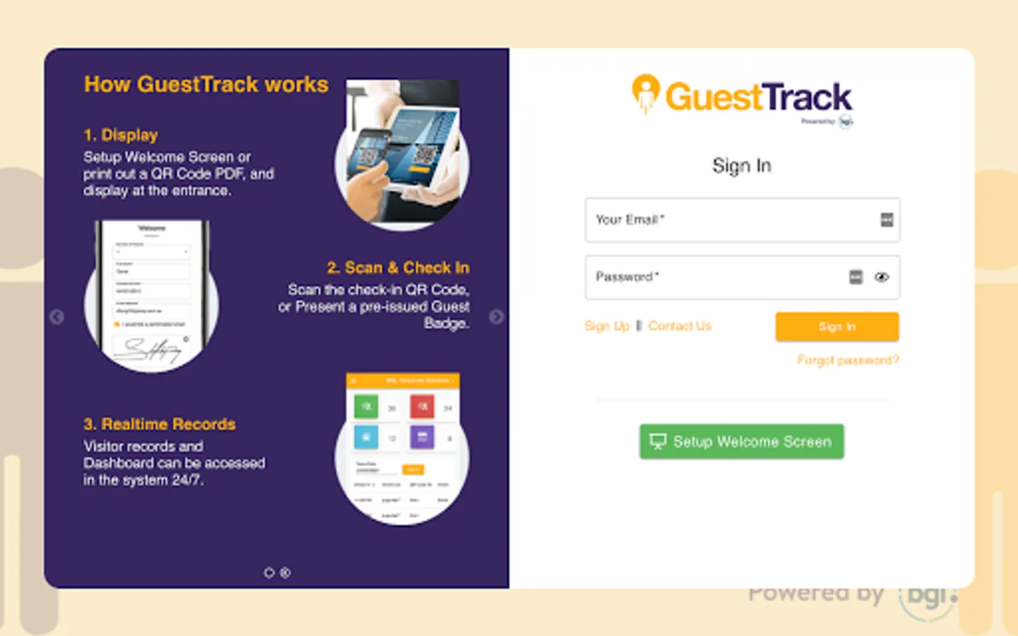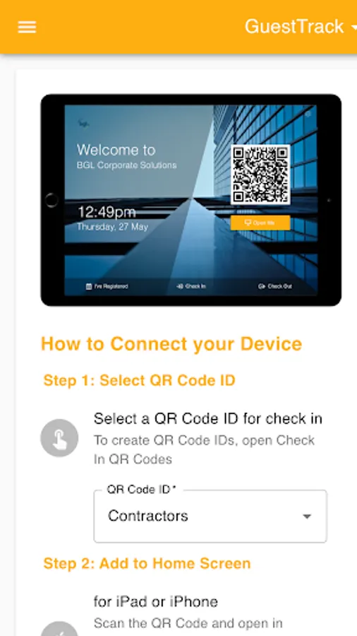 GuestTrack provides unlimited QR Code Check In, Pre-register, Check Out and Realtime Data. We are trusted by over 20,000 businesses and organisations, providing 25 million visitors with outstanding checkin experiences. Register Now. Free 14 Day Trial. No Credit Card Required.