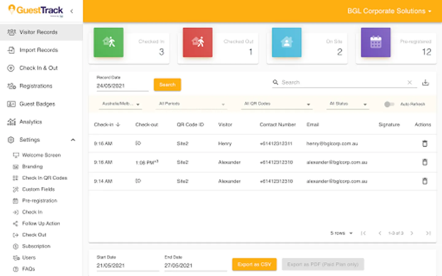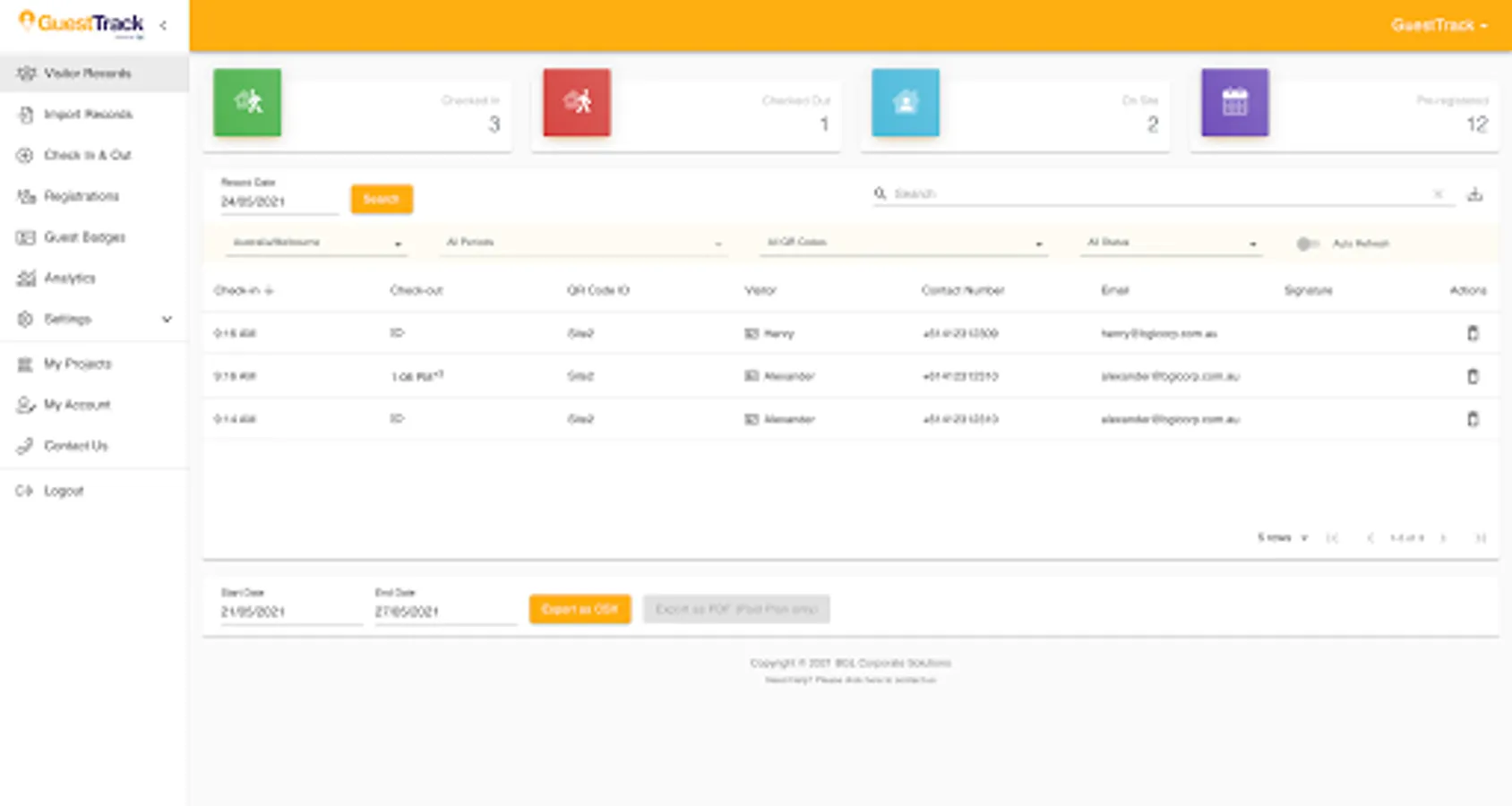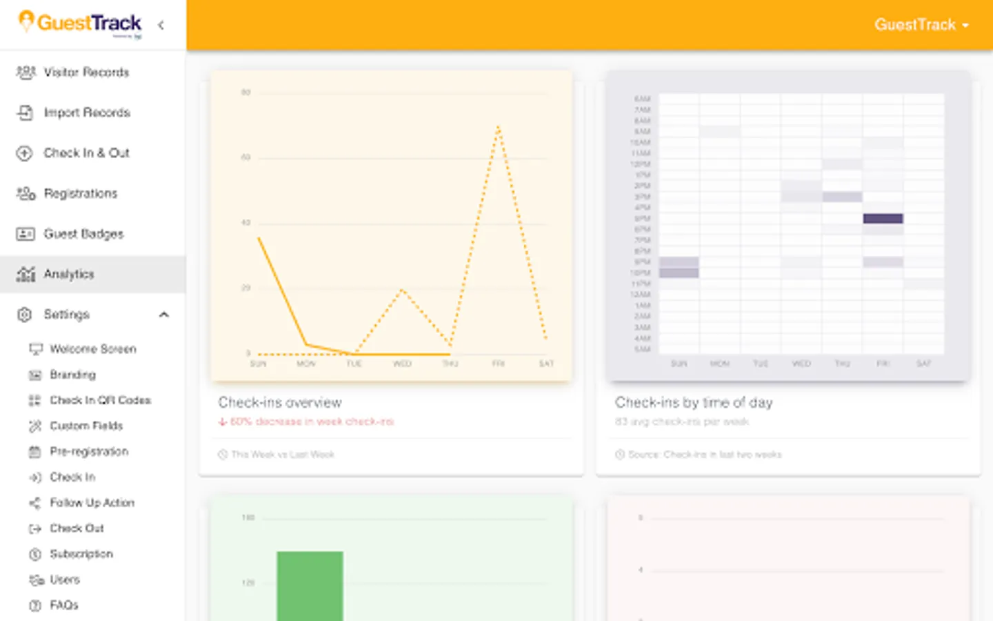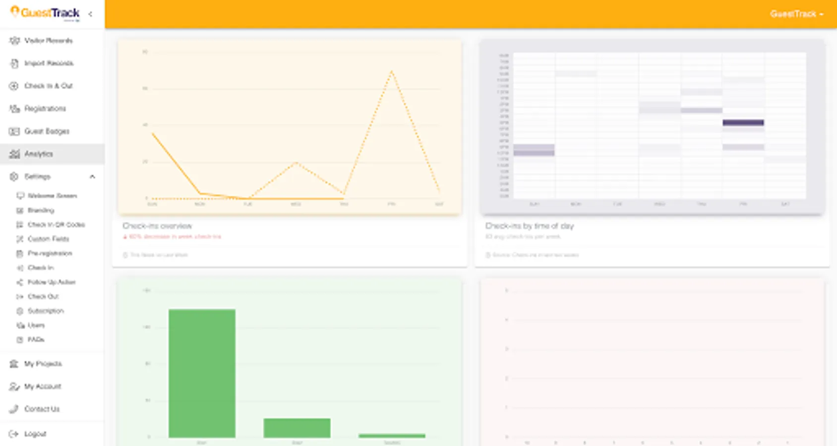 GuestTrack provides unlimited QR Code Check In, Pre-register, Check Out and Realtime Data. We are trusted by over 20,000 businesses and organisations, providing 25 million visitors with outstanding checkin experiences. Register Now. Free 14 Day Trial. No Credit Card Required.