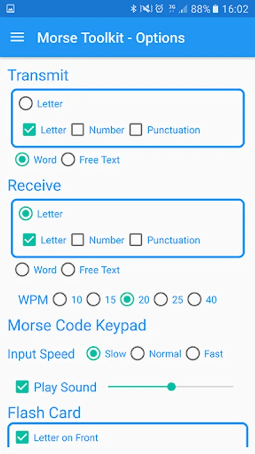 There are a couple of options allow you to choose different practices for transmitting and receive morse code, how you want flash card to be shown, morse code decoder sample rate etc.