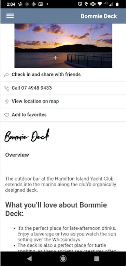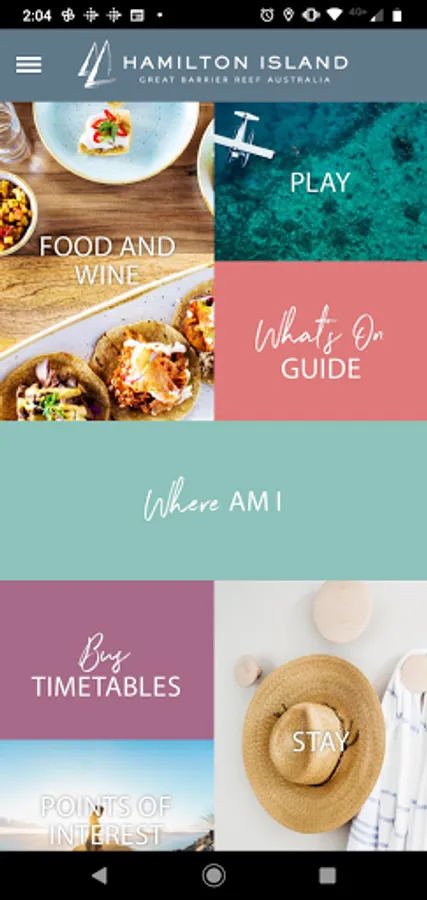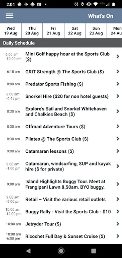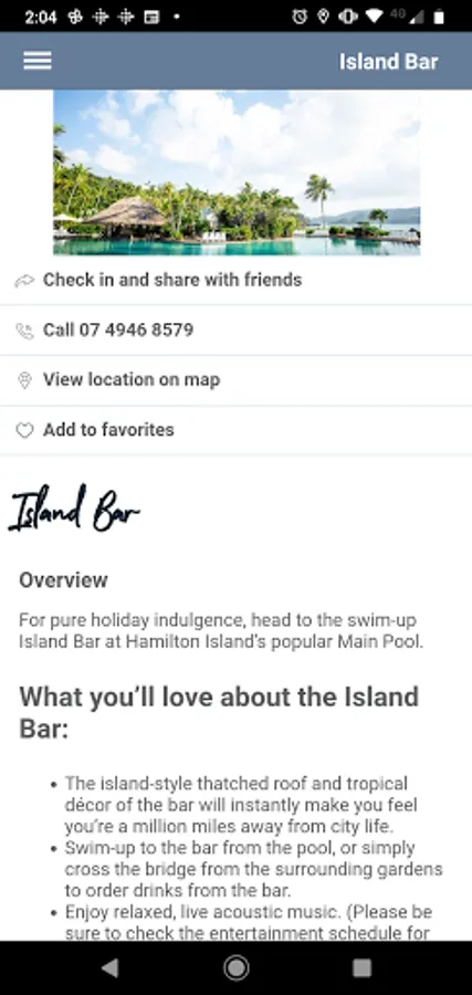 - Detailed listings of all the facilities, activities, and services offered to guests on Hamilton Island, with prompts on how to book, and when they are next scheduled