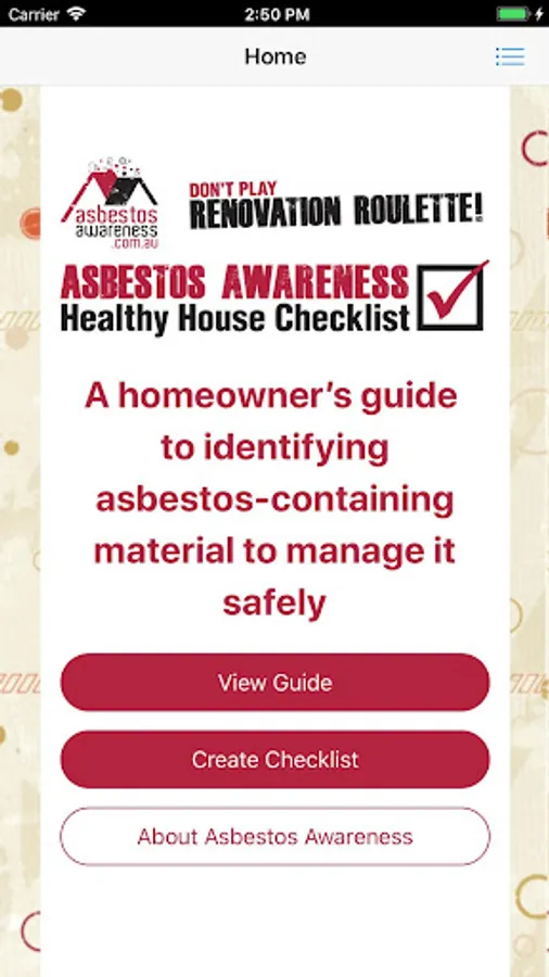 The Healthy House Checklist App is designed to empower homeowners and renovators with the tools they need to identify many of the asbestos-containing materials (ACM) that remain in one third of Aussie homes to ensure asbestos is managed safely.