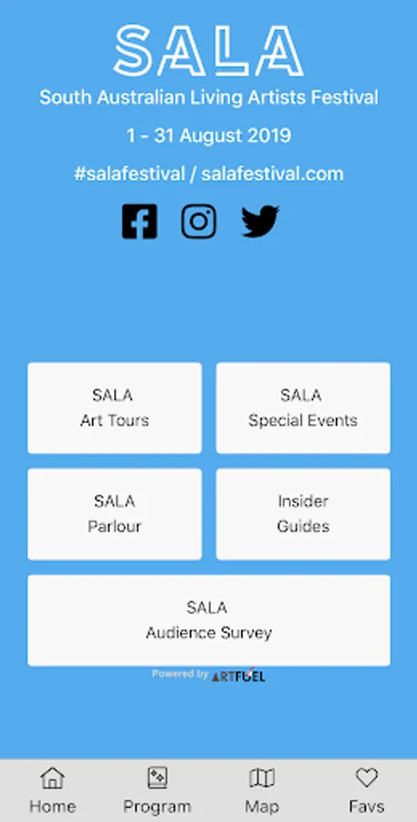 The "Connect" function will lead users to the SALA Festival Facebook, Twitter and Instagram pages via a pop-out to these apps. Feel free to share ideas and photos with us via Twitter and Instagram photos using our hashtag, #salafestival.