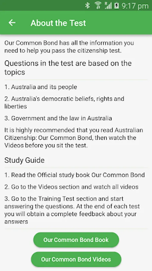 This application is fantastic for people who are preparing for the Australian Citizenship Test. It has all of the resources (official videos, PDF and training tests) so you can study 100% from your phone or tablet and succeed in the test!