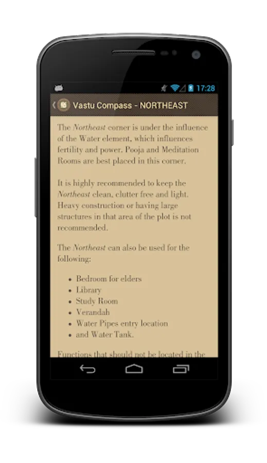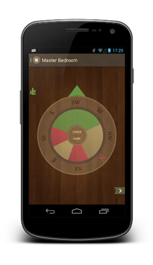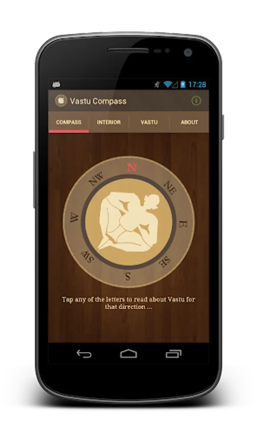 Stand in the centre of your home, although it is not required, and hold the mobile parallel to the floor. Press any of the letters on the compass to read more information for a given direction. For example, if you would like to know more about the North direction, tap the letter 'N' on the face of the compass.