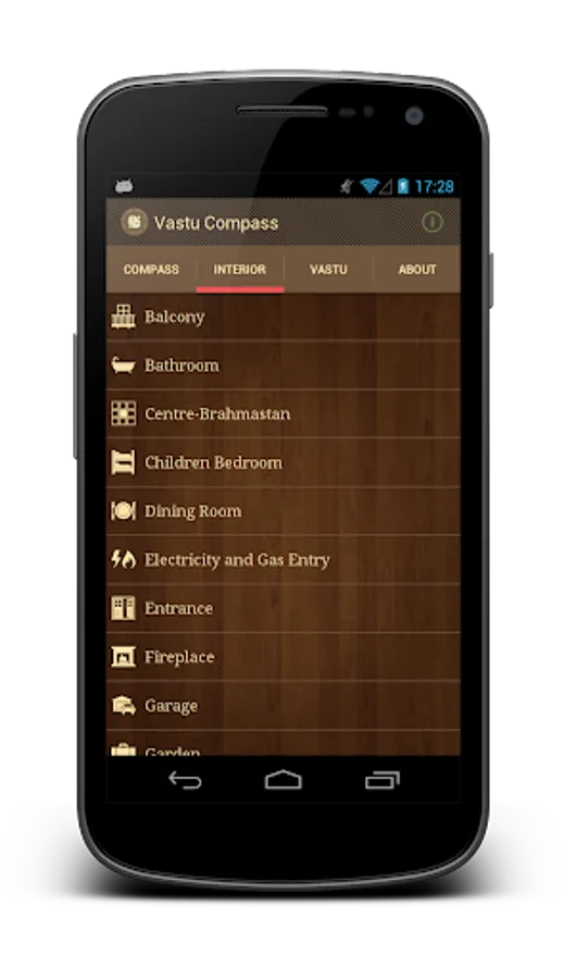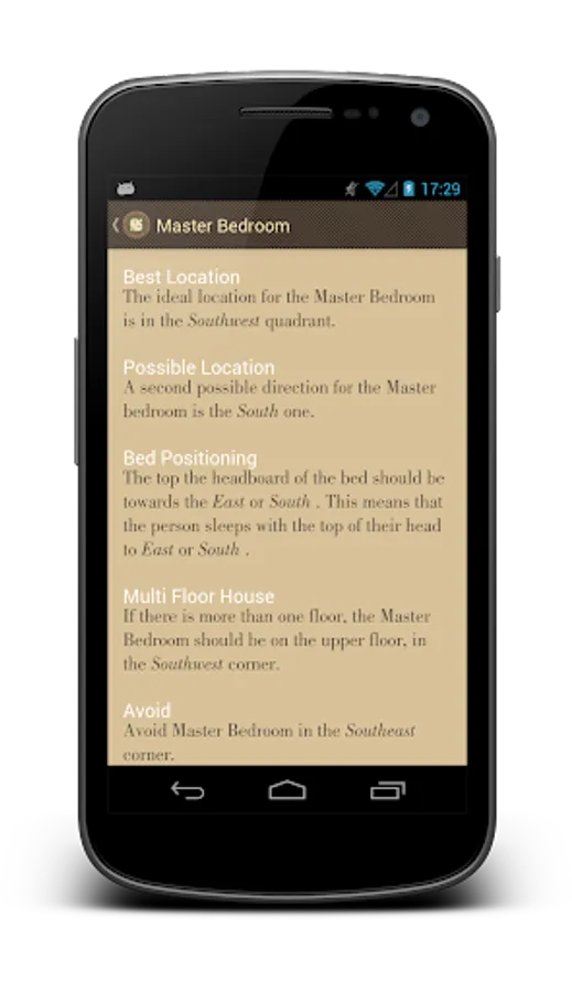 Stand in the centre of your place and hold the mobile parallel to the floor. Point the arrow towards the selected area. The colour of the arrow and the colour and shape of the hand indicator changes accordingly to whether Vastu for the selected area in a given direction is favourable, neutral or un-favourable. To read more detailed information swipe to the right.