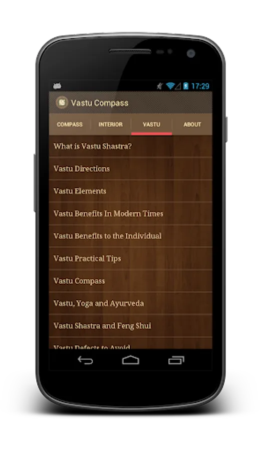 - The Vastu Compass app is built on the concepts of Vastu Shastra, the ancient Indian Science of holistic design that guides us in creating homes that are in tune with Nature, aligning them with the Earthly and Cosmic energies of this Universe.