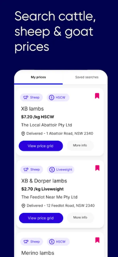 ∙ Search prices from abattoirs, feedlots, live exporters, backgrounders, restockers and traders. This means you’ll be able to see liveweight, over the hook (OTH) and dollar per head prices all in one place.