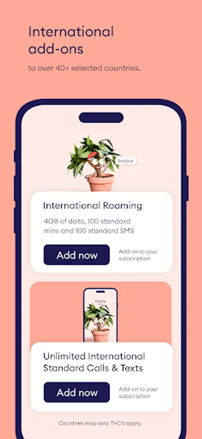 • Add International Roaming or Unlimited International Standard Calls & Texts
