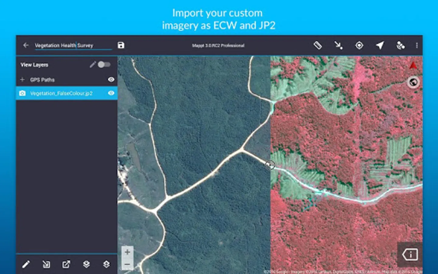 - Import unlimited sized satellite, aerial, geological, topographic, elevation and other types of imagery in ECW and JP2 format