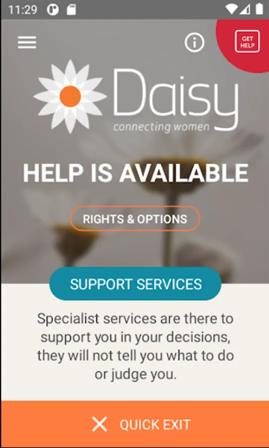 Daisy is free and connects women around Australia to services providing support for the impacts of sexual assault family violence and domestic violence. Family members and friends can also use Daisy to gather information and support women’s decision making. Before downloading this App or sharing it with anyone consider safety. If a device is not private, it may not be safe to download or share.