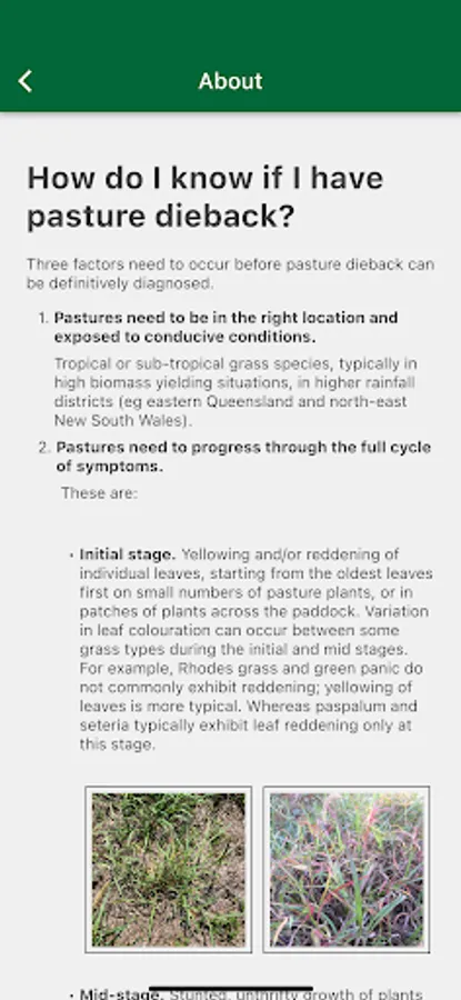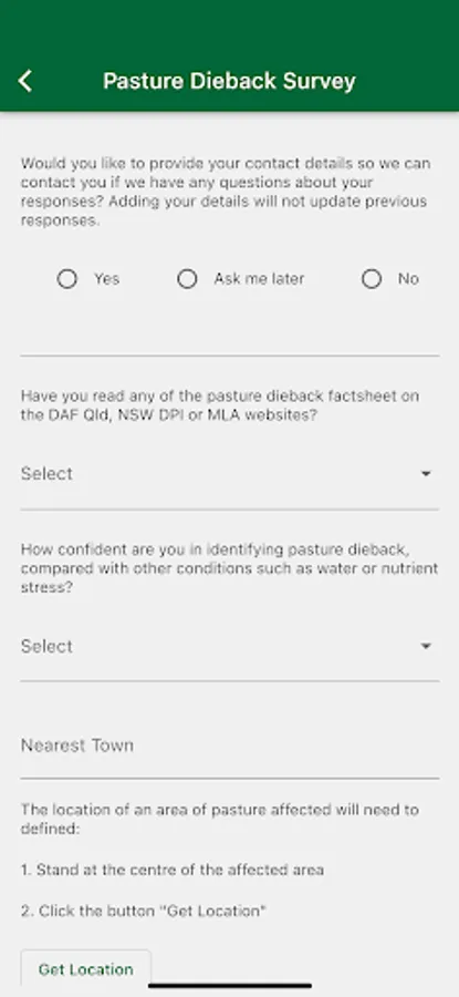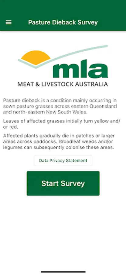 Pasture Dieback Survey is a survey tool for reporting suspected or confirmed Pasture Dieback in tropical and sub-tropical grass pastures in grazing lands. Development has been co-ordinated by the Department of Agriculture and Fisheries Queensland, on behalf of Meat and Livestock Australia (MLA).