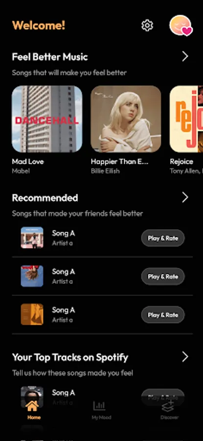 MoodyTunes will not share any of your personal information or sell your data to others. Please note that MoodyTunes is not an alternative to professional medical or mental health support. If you are experiencing symptoms of depression or are having thoughts of self-harm please reach out to professional help services, such as via resources available in MoodyTunes or through other online sources.