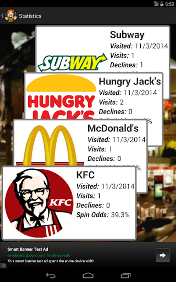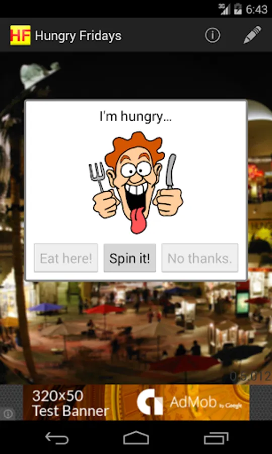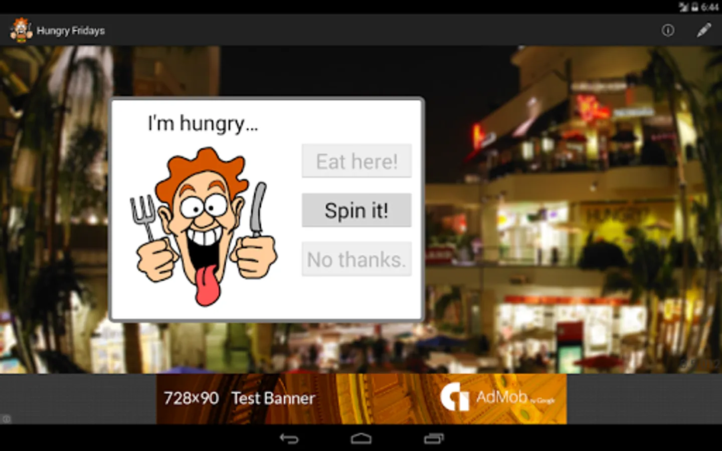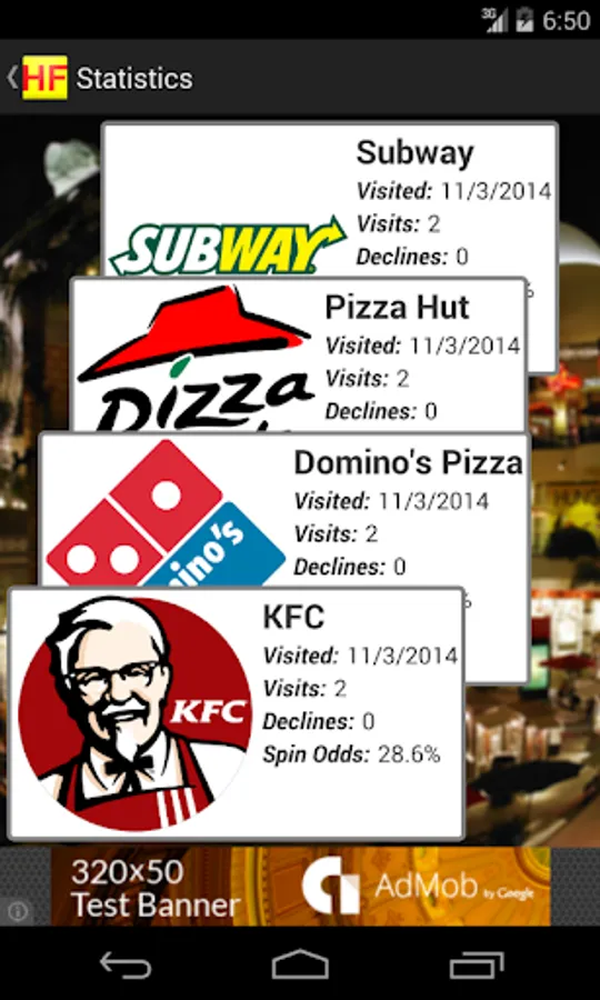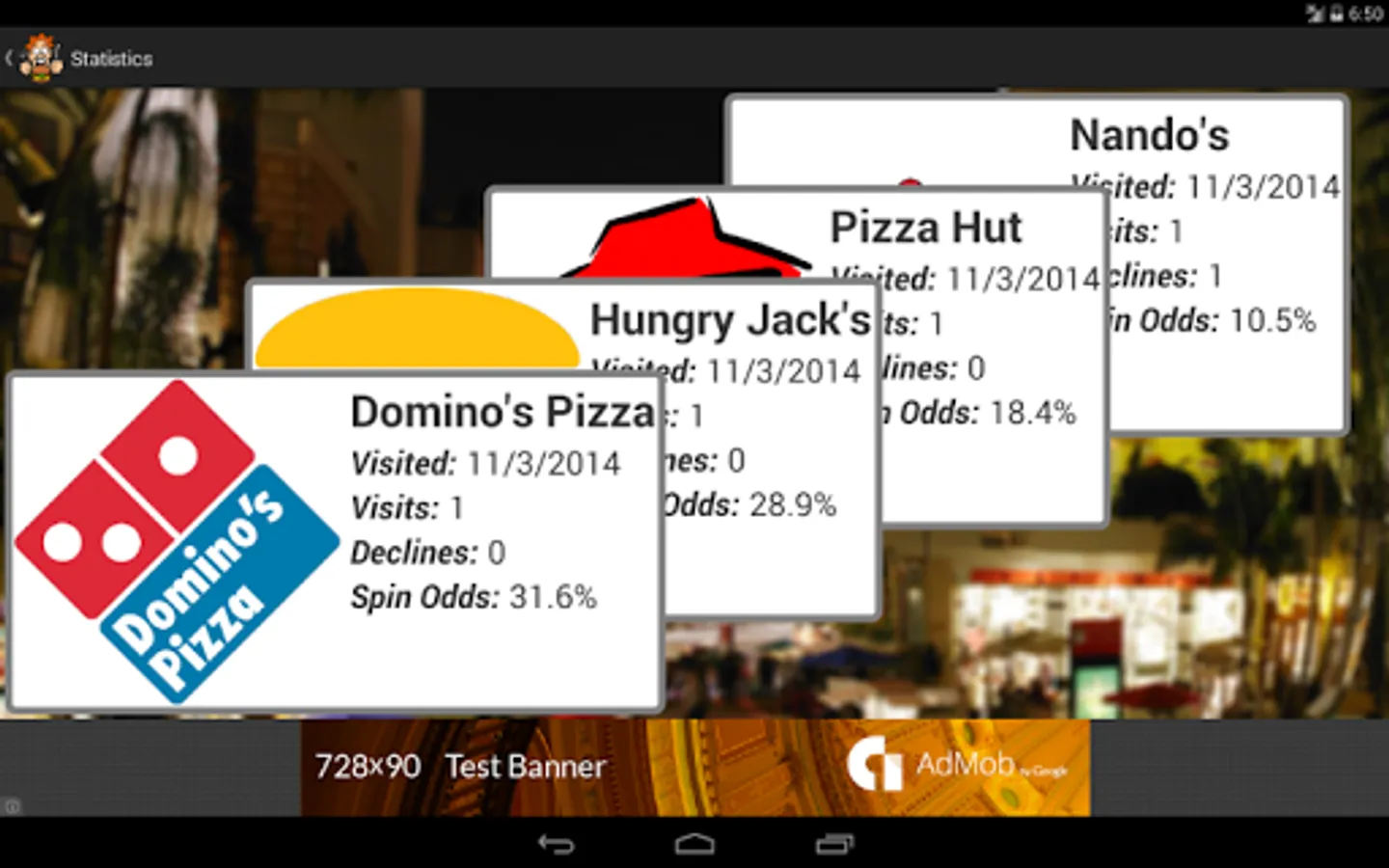 • Statistics: Hungry Friday's keeps track of all the restaurants you have visited, the number of times you have visited them, the number of times you have declined to go, as well as the odds of each one being spun up!