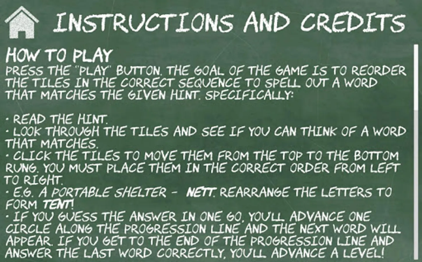 Press the PLAY button. The goal of the game is to reorder the tiles in the correct sequence to spell out a word that matches the given hint. Specifically: