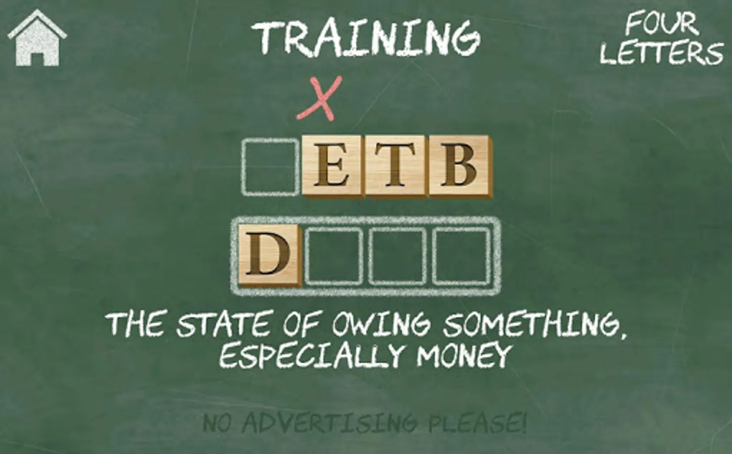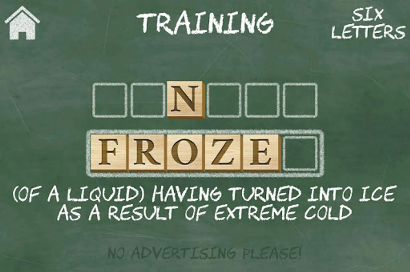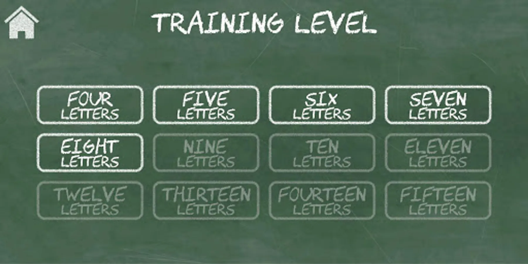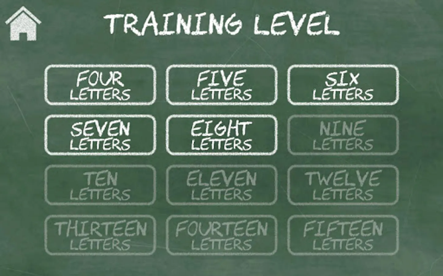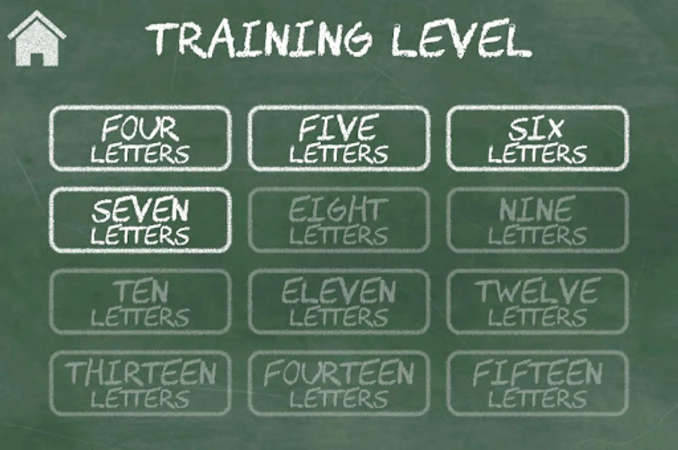 Press the TRAIN button. Select the number of letters that you would like to train. Note: only four-letter words will be available at the beginning. Play the game to unlock further training. Training allows you to practise words of a particular length over and over again. It's a great way to improve your spelling and vocabulary.